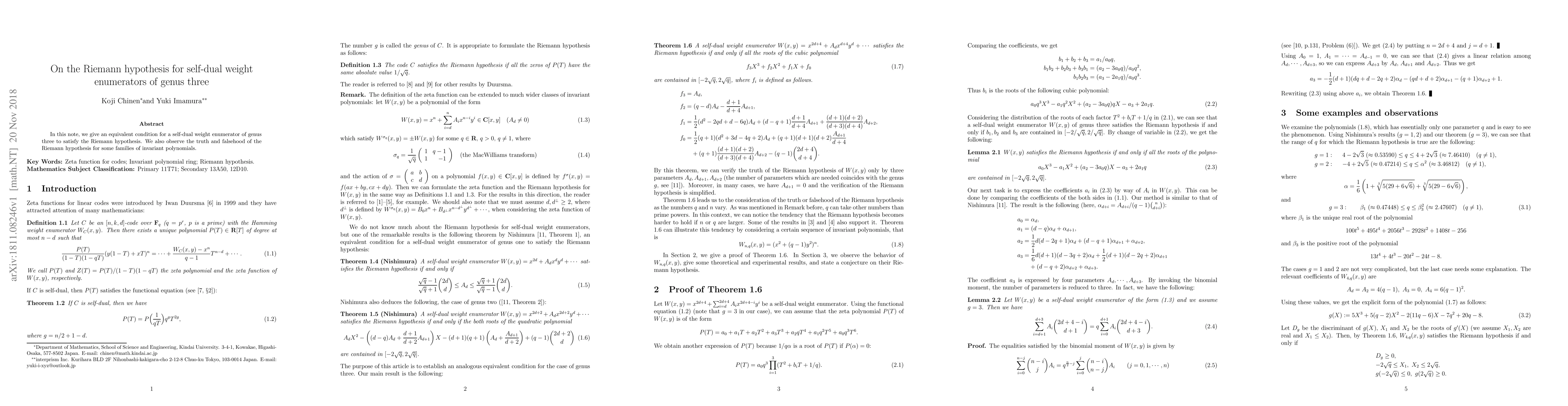 In this note, we give an equivalent condition for a self-dual weight enumerator of genus three to satisfy the Riemann hypothesis. We also observe the truth and falsehood of the Riemann hypothesis for some families of invariant polynomials.