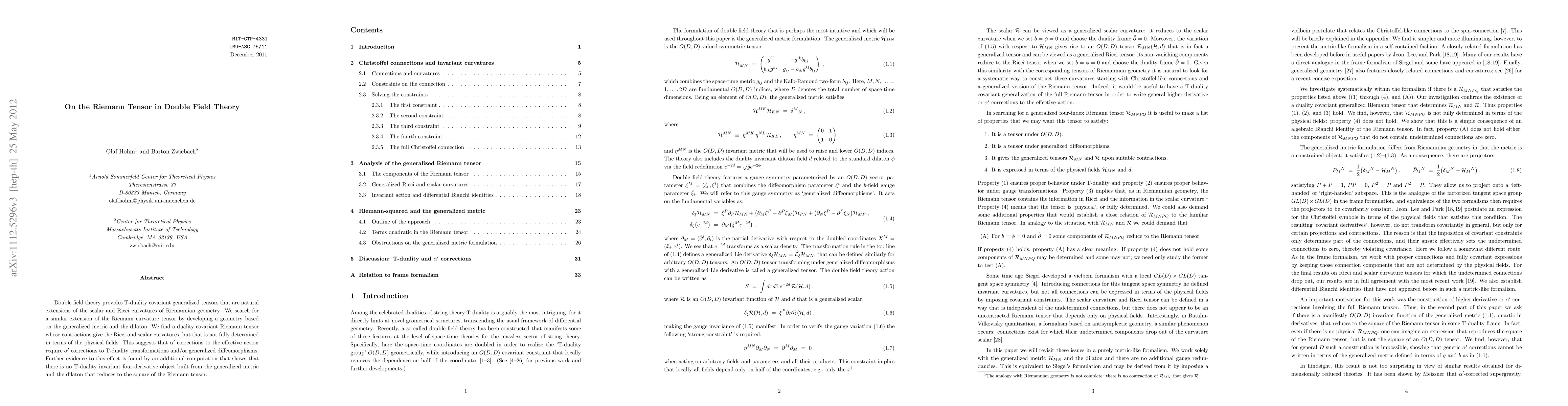 This paper develops a T-duality covariant extension of the Riemann curvature tensor in Double Field Theory, finding a tensor whose contractions yield Ricci and scalar curvatures but remains undetermined by physical fields, suggesting \alpha' corrections to the effective action and T-duality transformations. Additionally, it shows no T-duality invariant four-derivative object can be constructed from the generalized metric and dilaton that reduces to the square of the Riemann tensor.