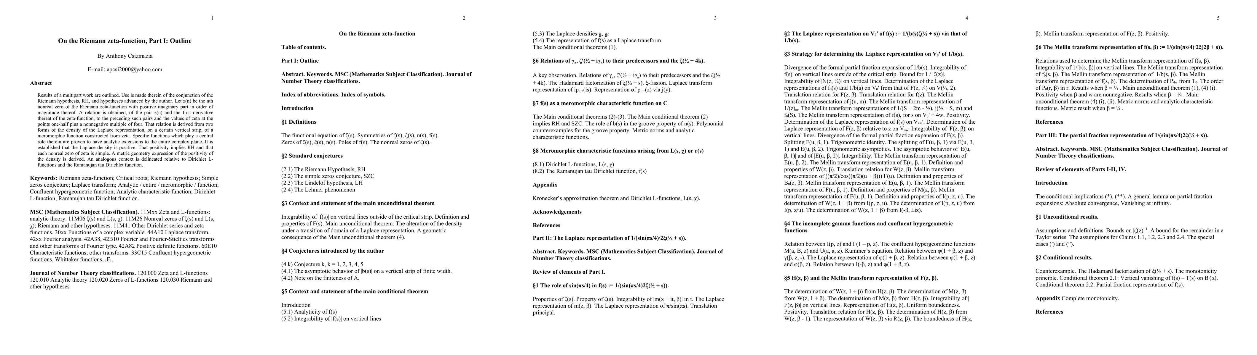 Results of a multipart work are outlined. Use is made therein of the conjunction of the Riemann hypothesis, RH, and hypotheses advanced by the author. Let z(n) be the nth nonreal zero of the Riemann zeta-function with positive imaginary part in order of magnitude thereof. A relation is obtained, of the pair z(n) and the first derivative thereat of the zeta-function, to the preceding such pairs and the values of zeta at the points one-half plus a nonnegative multiple of four. That relation is derived from two forms of the density of the Laplace representation, on a certain vertical strip, of a meromorphic function constructed from zeta. Specific functions which play a central role therein are proven to have analytic extensions to the entire complex plane. It is established that the Laplace density is positive. That positivity implies RH and that each nonreal zero of zeta is simple. A metric geometry expression of the positivity of the density is derived. An analogous context is delineated relative to Dirichlet L-functions and the Ramanujan tau Dirichlet function.