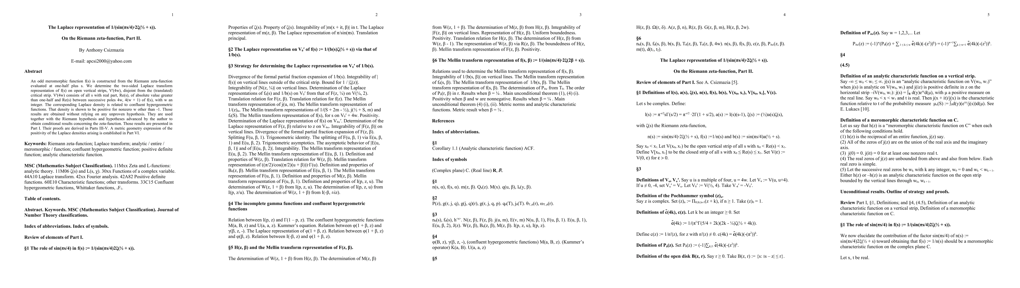 An odd meromorphic function f(s) is constructed from the Riemann zeta-function evaluated at one-half plus s. We determine the two-sided Laplace transform representation of f(s) on open vertical strips, V'(4w), disjoint from the (translated) critical strip. V'(4w) consists of all s with real part, Re(s), of absolute value greater than one-half and Re(s) between successive poles 4w, 4(w + 1) of f(s), with w an integer. The corresponding Laplace density is related to confluent hypergeometric functions. That density is shown to be positive for nonzero w other than -1. Those results are obtained without relying on any unproven hypothesis. They are used together with the Riemann hypothesis and hypotheses advanced by the author to obtain conditional results concerning the zeta-function. Those results are presented in Part I. Their proofs are derived in Parts III-V. A metric geometry expression of the positivity of the Laplace densities arising is established in Part VI.