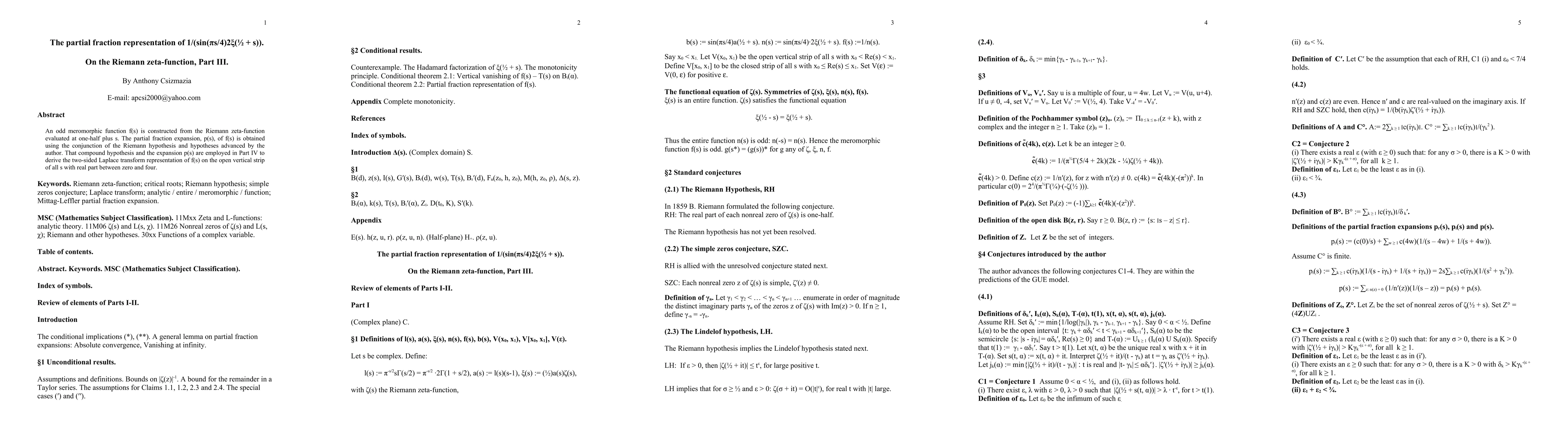 This paper constructs an odd meromorphic function f(s) from the Riemann zeta-function evaluated at 1/2 + s, and uses a compound hypothesis involving the Riemann hypothesis to derive its partial fraction expansion p(s). This expansion will be utilized in Part IV to obtain the two-sided Laplace transform representation of f(s) in the open vertical strip where the real part of s lies between 0 and 4.