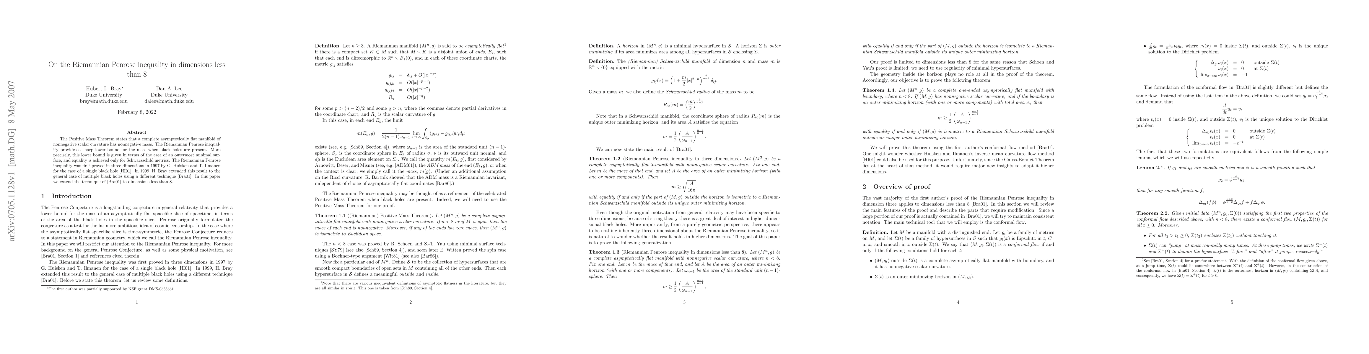 The Positive Mass Theorem states that a complete asymptotically flat manifold of nonnegative scalar curvature has nonnegative mass. The Riemannian Penrose inequality provides a sharp lower bound for the mass when black holes are present. More precisely, this lower bound is given in terms of the area of an outermost minimal surface, and equality is achieved only for Schwarzschild metrics. The Riemannian Penrose inequality was first proved in three dimensions in 1997 by G. Huisken and T. Ilmanen for the case of a single black hole. In 1999, H. Bray extended this result to the general case of multiple black holes using a different technique. In this paper we extend Bray's technique to dimensions less than 8.