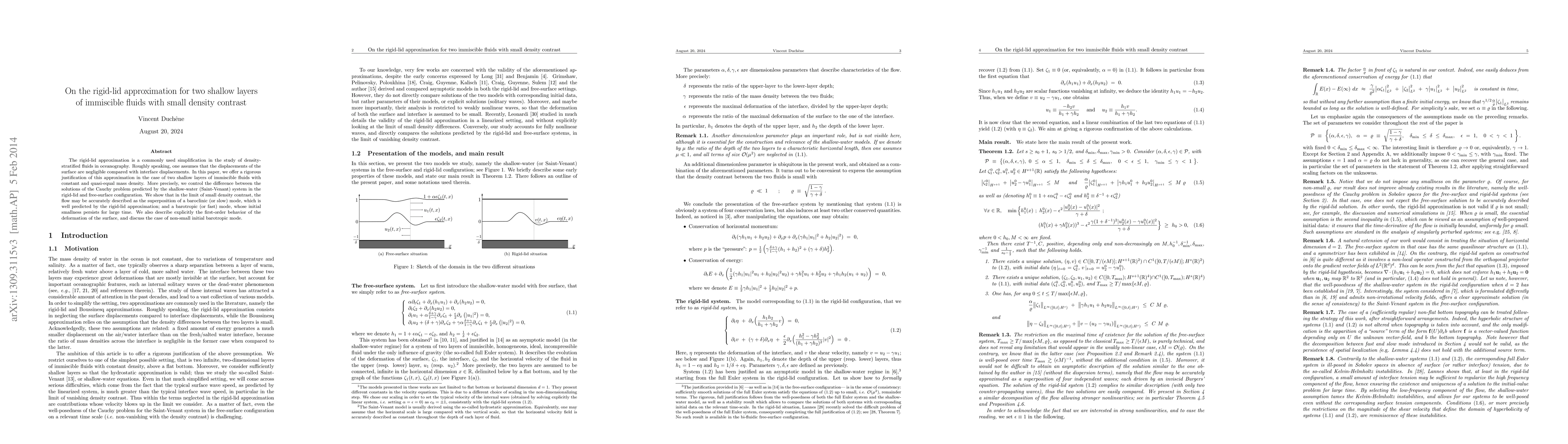 This paper rigorously justifies the rigid-lid approximation for two shallow layers of immiscible fluids with small density contrast, showing that the flow can be accurately described by a baroclinic mode and a persistent barotropic mode. The study controls the difference between solutions from the rigid-lid and free-surface configurations.