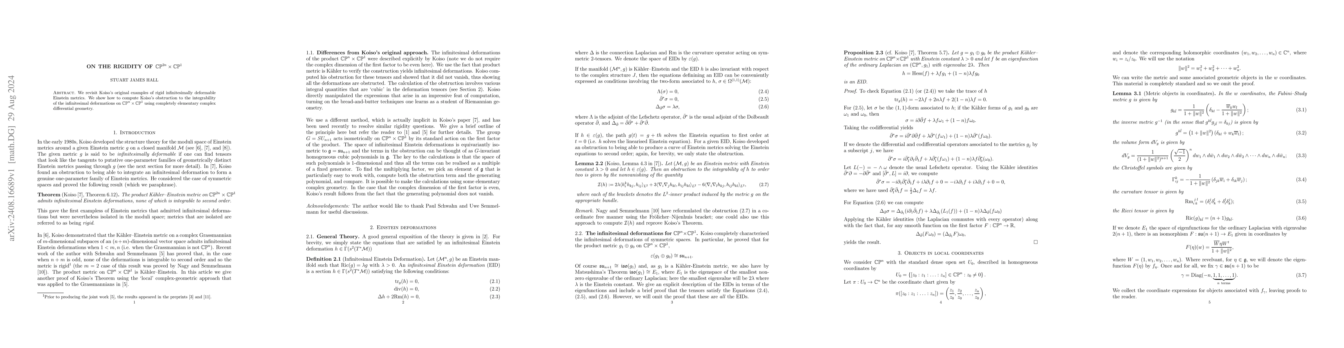 We revisit Koiso's original examples of rigid infinitesimally deformable Einstein metrics. We show how to compute Koiso's obstruction to the integrability of the infinitesimal deformations on $\mathbb{CP}^{n}\times \mathbb{CP}^{1}$ using completely elementary complex differential geometry.