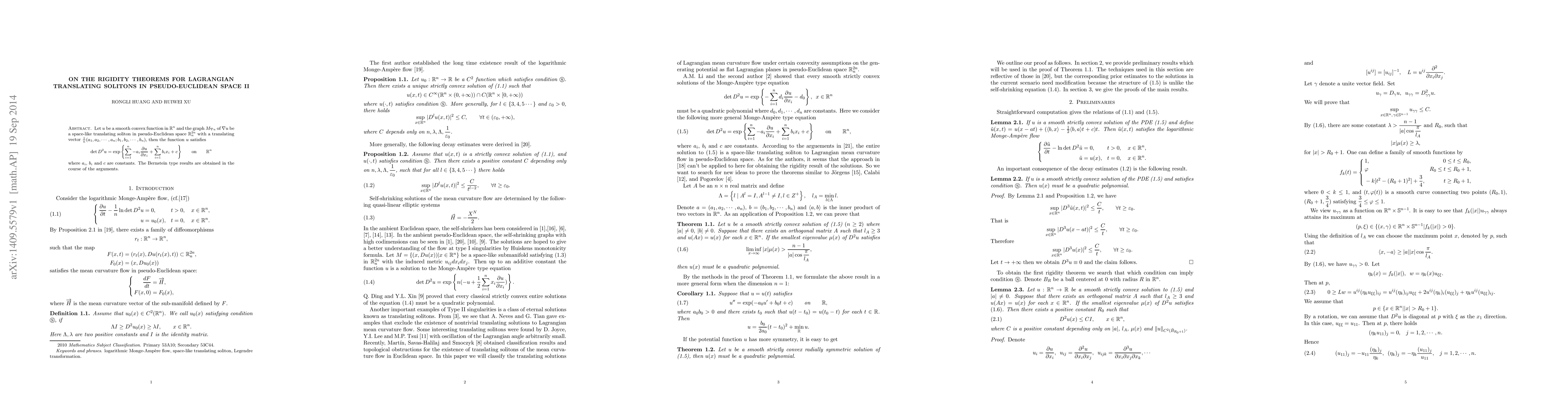 This paper proves rigidity theorems for Lagrangian translating solitons in pseudo-Euclidean space, showing that a smooth convex function $u$ whose graph is a space-like translating soliton satisfies a specific determinant condition, leading to Bernstein type results.