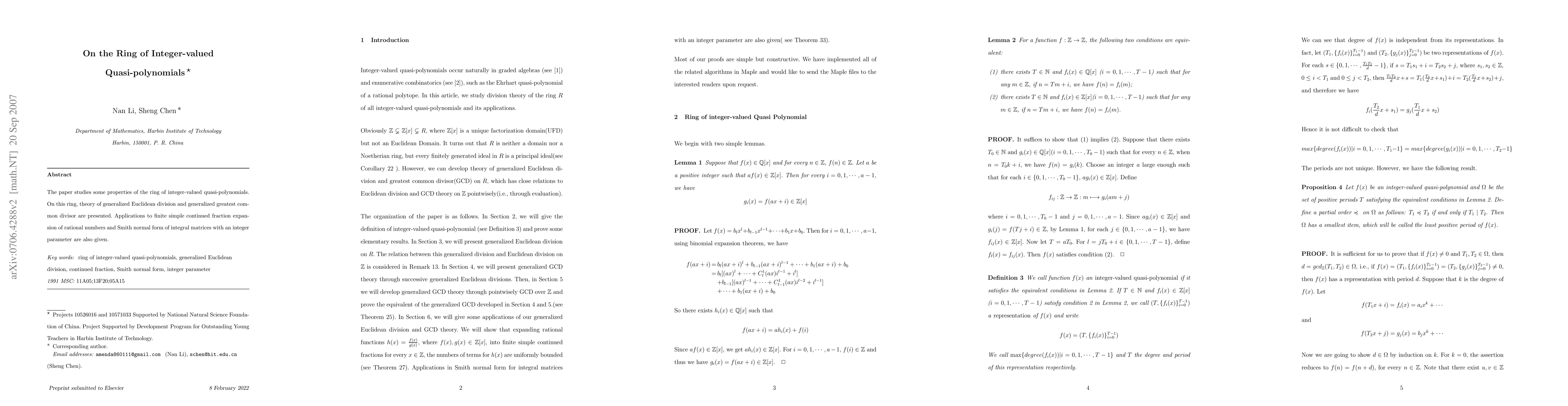 The paper explores the ring of integer-valued quasi-polynomials, presenting a theory of generalized Euclidean division and GCD, and applies these concepts to finite simple continued fractions and Smith normal forms of integral matrices.