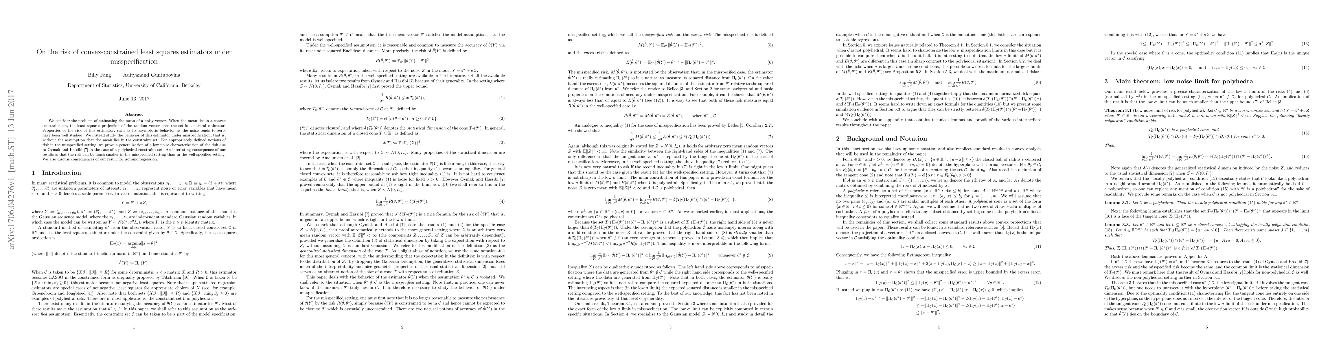 We consider the problem of estimating the mean of a noisy vector. When the mean lies in a convex constraint set, the least squares projection of the random vector onto the set is a natural estimator. Properties of the risk of this estimator, such as its asymptotic behavior as the noise tends to zero, have been well studied. We instead study the behavior of this estimator under misspecification, that is, without the assumption that the mean lies in the constraint set. For appropriately defined notions of risk in the misspecified setting, we prove a generalization of a low noise characterization of the risk due to Oymak and Hassibi in the case of a polyhedral constraint set. An interesting consequence of our results is that the risk can be much smaller in the misspecified setting than in the well-specified setting. We also discuss consequences of our result for isotonic regression.