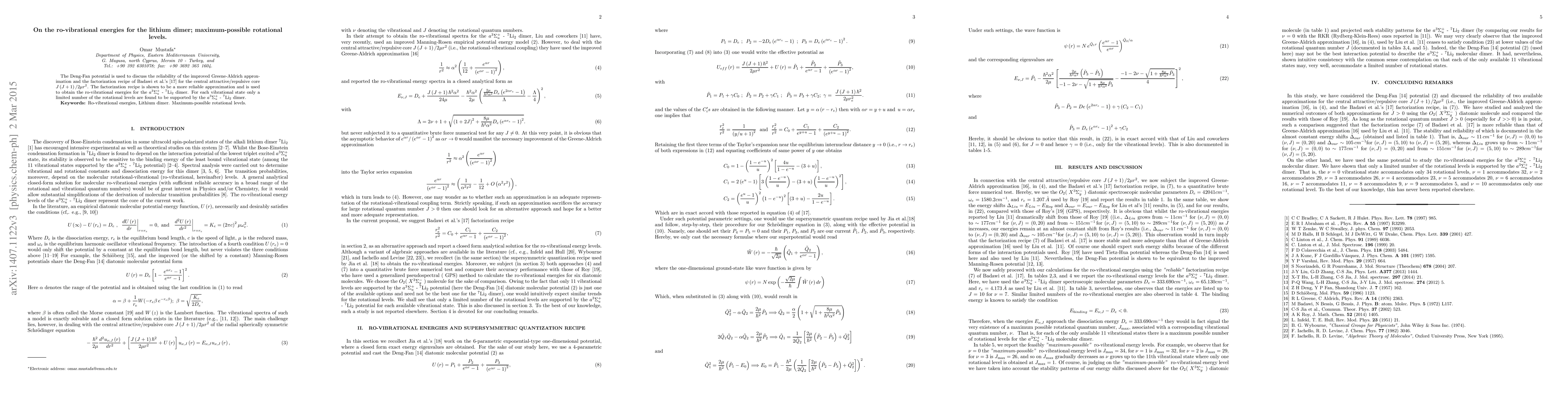 This paper evaluates the Deng-Fan potential to assess the improved Greene-Aldrich approximation and Badawi et al.'s factorization recipe for the lithium dimer's central core. The factorization recipe proves more reliable and is used to determine the maximum possible rotational levels for each vibrational state of the lithium dimer.