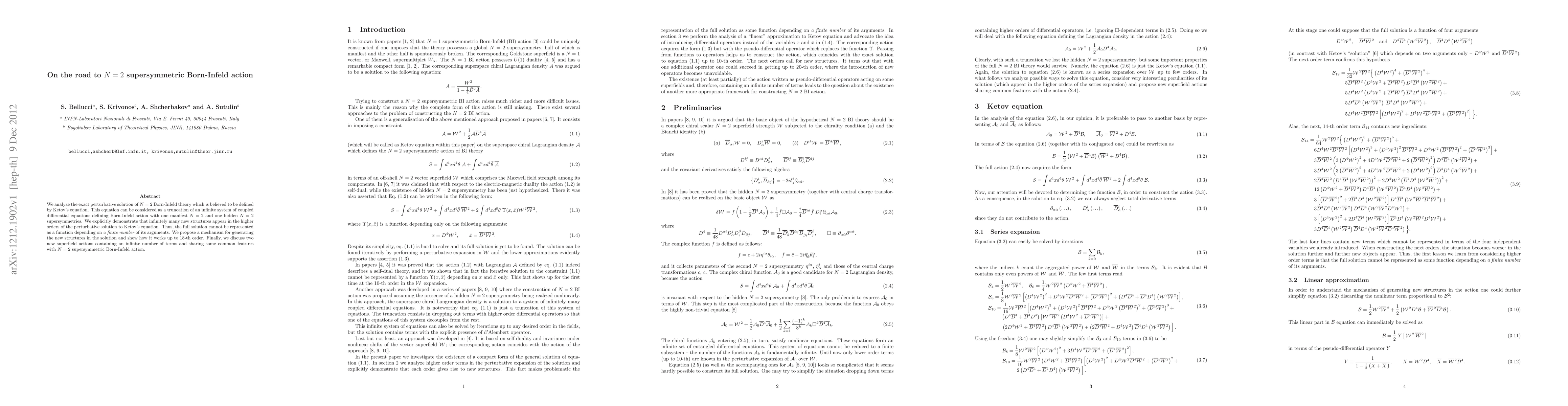 We analyze the exact perturbative solution of N=2 Born-Infeld theory which is believed to be defined by Ketov's equation. This equation can be considered as a truncation of an infinite system of coupled differential equations defining Born-Infeld action with one manifest N=2 and one hidden N=2 supersymmetries. We explicitly demonstrate that infinitely many new structures appear in the higher orders of the perturbative solution to Ketov's equation. Thus, the full solution cannot be represented as a function depending on {\it a finite number} of its arguments. We propose a mechanism for generating the new structures in the solution and show how it works up to 18-th order. Finally, we discuss two new superfield actions containing an infinite number of terms and sharing some common features with N=2 supersymmetric Born-Infeld action.