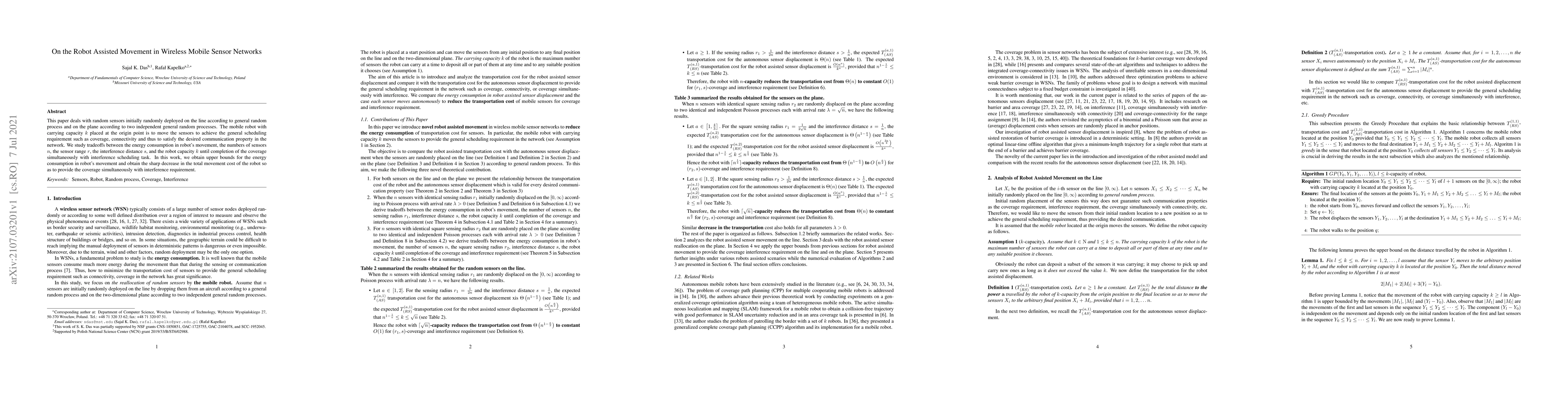 A research paper explores how a robot can efficiently move sensors in wireless mobile sensor networks to achieve coverage, connectivity, and communication goals while minimizing energy consumption.
