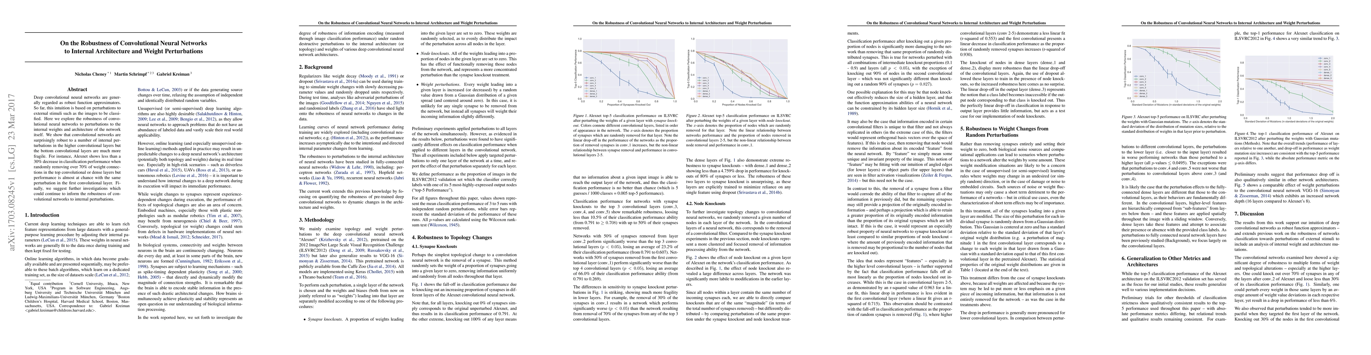 This paper investigates the robustness of convolutional neural networks to internal perturbations, finding that higher layers are surprisingly resilient while lower layers are much more fragile. Alexnet maintains over 70% performance even with significant weight removal in top layers, but performance drops drastically with similar perturbations in the first layer.
