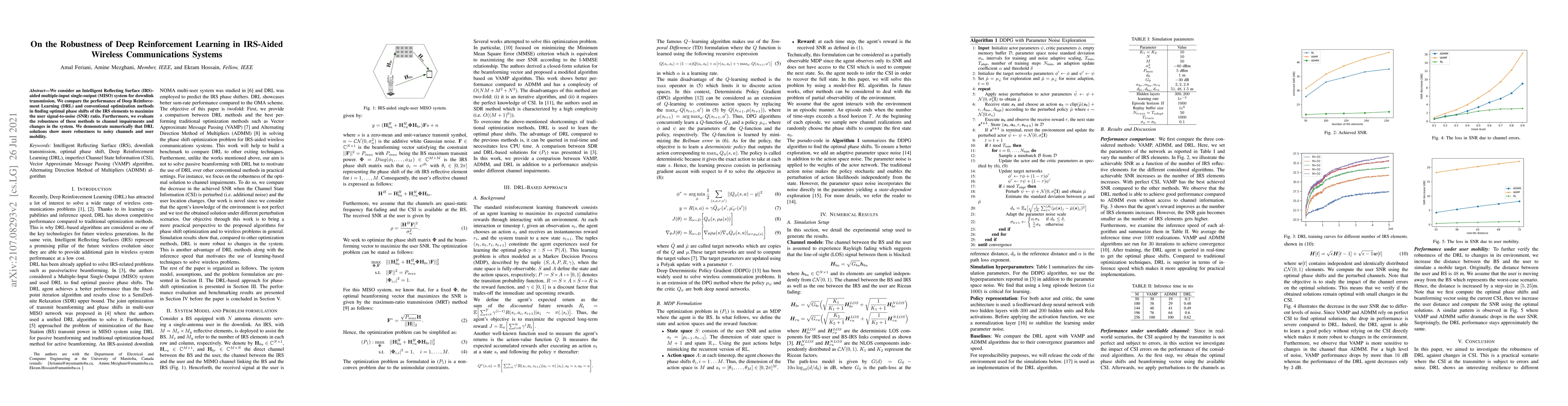 Summary: This paper evaluates Deep Reinforcement Learning (DRL) against conventional optimization methods in IRS-aided MISO systems for maximizing user SNR. It finds that DRL demonstrates greater robustness to channel impairments and user mobility compared to traditional methods.