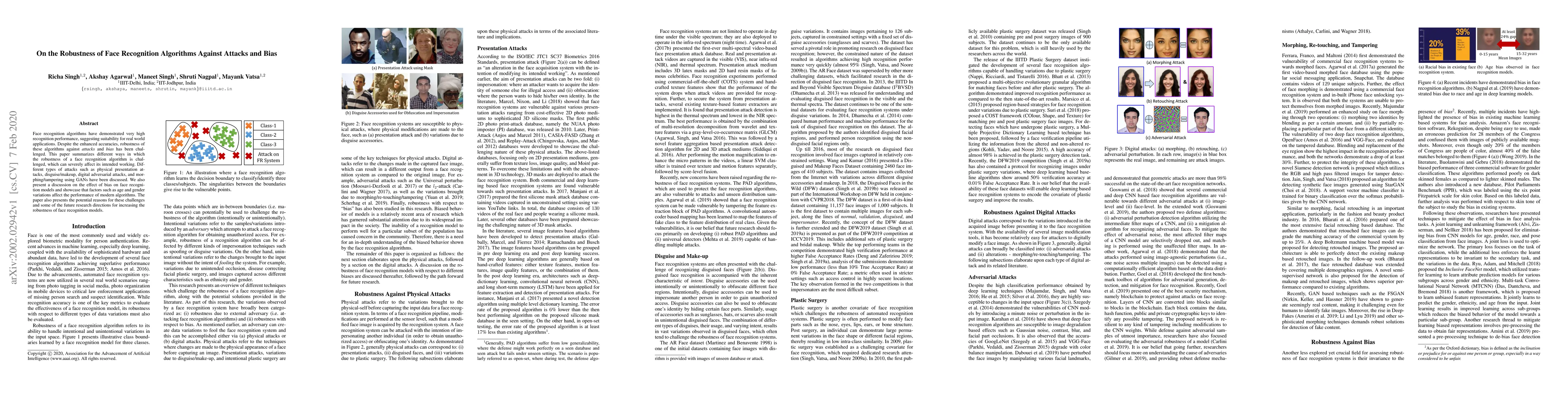 This paper examines the vulnerabilities of face recognition algorithms to attacks and biases, including physical presentation attacks, disguises, adversarial digital attacks, and GAN-based tampering. It also discusses how age and gender biases impact algorithm performance and suggests future research directions to enhance robustness.