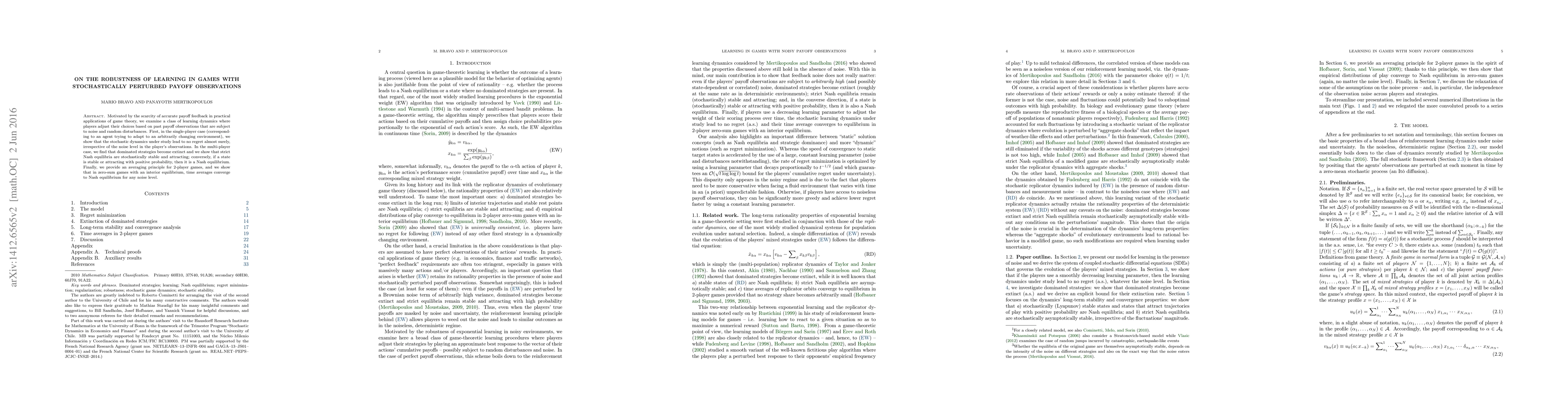 Researchers show that learning in games with noisy payoff observations leads to no regret almost surely and stable Nash equilibria, even in the presence of random disturbances.