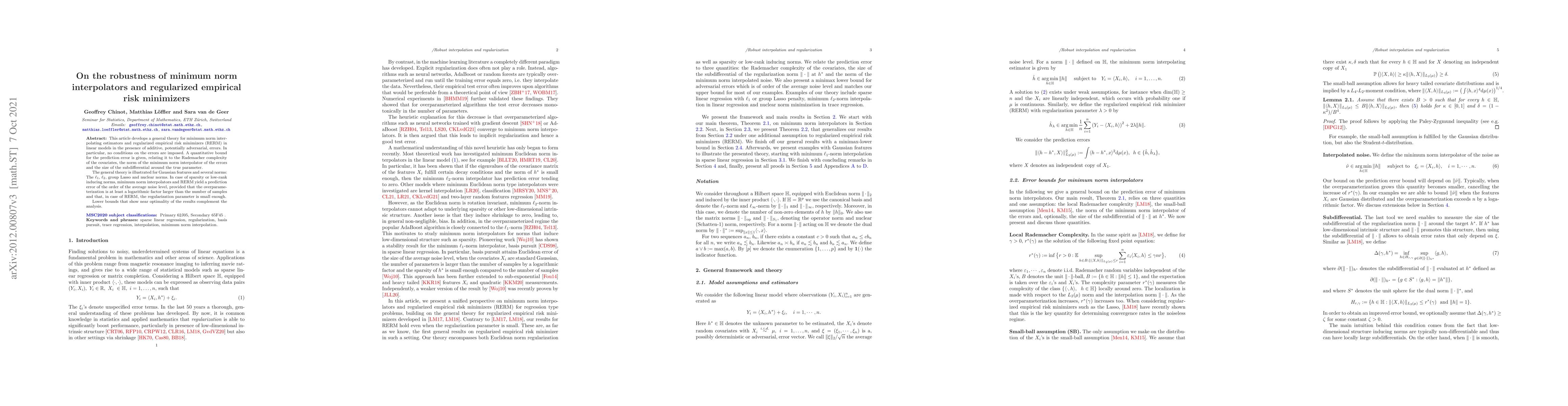 This article develops a general theory for minimum norm interpolating estimators and regularized empirical risk minimizers (RERM) in linear models in the presence of additive, potentially adversarial, errors. In particular, no conditions on the errors are imposed. A quantitative bound for the prediction error is given, relating it to the Rademacher complexity of the covariates, the norm of the minimum norm interpolator of the errors and the size of the subdifferential around the true parameter. The general theory is illustrated for Gaussian features and several norms: The $\ell_1$, $\ell_2$, group Lasso and nuclear norms. In case of sparsity or low-rank inducing norms, minimum norm interpolators and RERM yield a prediction error of the order of the average noise level, provided that the overparameterization is at least a logarithmic factor larger than the number of samples and that, in case of RERM, the regularization parameter is small enough. Lower bounds that show near optimality of the results complement the analysis.