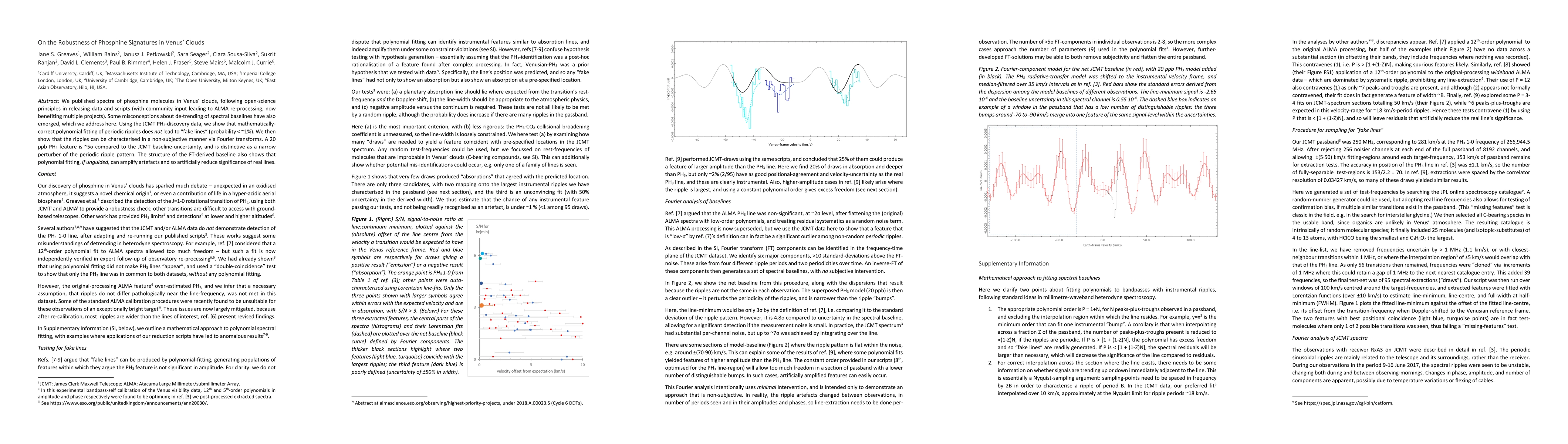 We published spectra of phosphine molecules in Venus' clouds, following open-science principles in releasing data and scripts (with community input leading to ALMA re-processing, now benefiting multiple projects). Some misconceptions about de-trending of spectral baselines have also emerged, which we address here. Using the JCMT PH3-discovery data, we show that mathematically-correct polynomial fitting of periodic ripples does not lead to "fake lines" (probability < ~1%). We then show that the ripples can be characterised in a non-subjective manner via Fourier transforms. A 20 ppb PH3 feature is ~5{\sigma} compared to the JCMT baseline-uncertainty, and is distinctive as a narrow perturber of the periodic ripple pattern. The structure of the FT-derived baseline also shows that polynomial fitting, if unguided, can amplify artefacts and so artificially reduce significance of real lines.