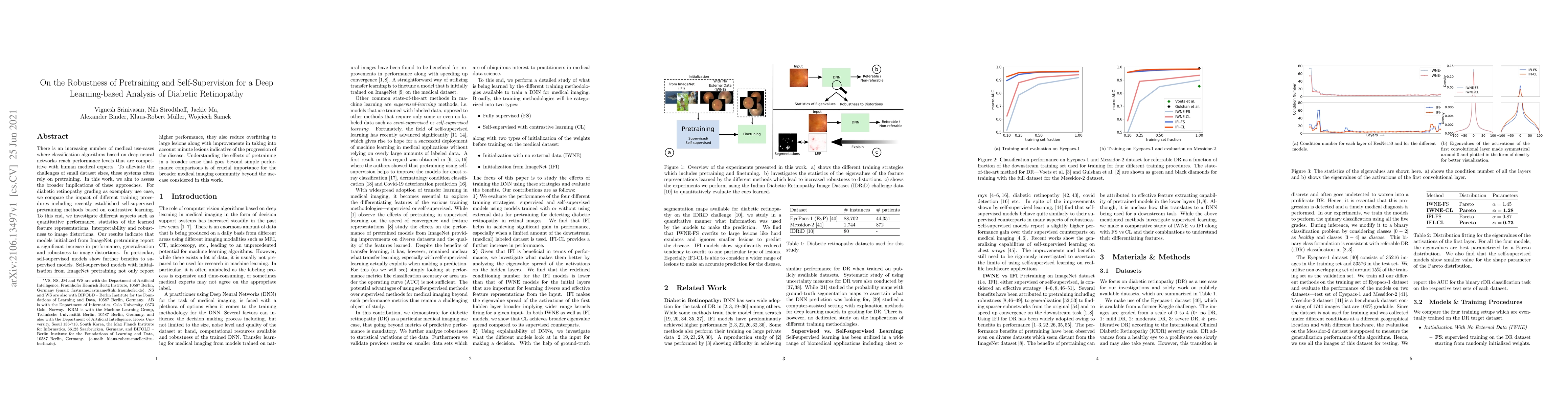There is an increasing number of medical use-cases where classification algorithms based on deep neural networks reach performance levels that are competitive with human medical experts. To alleviate the challenges of small dataset sizes, these systems often rely on pretraining. In this work, we aim to assess the broader implications of these approaches. For diabetic retinopathy grading as exemplary use case, we compare the impact of different training procedures including recently established self-supervised pretraining methods based on contrastive learning. To this end, we investigate different aspects such as quantitative performance, statistics of the learned feature representations, interpretability and robustness to image distortions. Our results indicate that models initialized from ImageNet pretraining report a significant increase in performance, generalization and robustness to image distortions. In particular, self-supervised models show further benefits to supervised models. Self-supervised models with initialization from ImageNet pretraining not only report higher performance, they also reduce overfitting to large lesions along with improvements in taking into account minute lesions indicative of the progression of the disease. Understanding the effects of pretraining in a broader sense that goes beyond simple performance comparisons is of crucial importance for the broader medical imaging community beyond the use-case considered in this work.