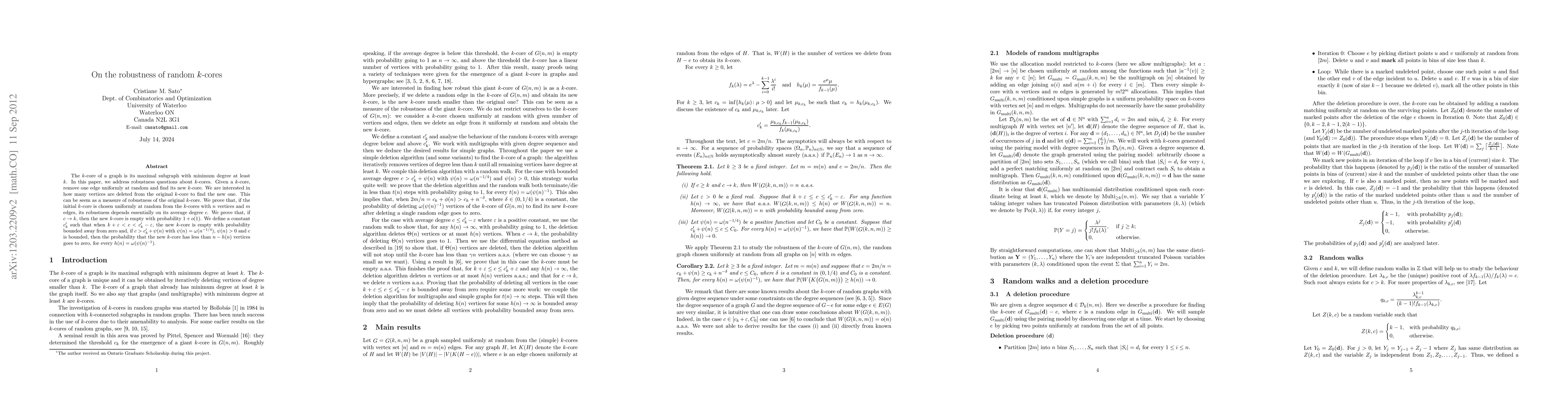 The k-core of a graph is its maximal subgraph with minimum degree at least k. In this paper, we address robustness questions about k-cores. Given a k-core, remove one edge uniformly at random and find its new k-core. We are interested in how many vertices are deleted from the original k-core to find the new one. This can be seem as a measure of robustness of the original k-core. We prove that, if the initial k-core is chosen uniformly at random from the k-cores with n vertices and m edges, its robustness depends essentially on its average degree c. We prove that, if c converges to k, then the new k-core is empty with probability 1+o(1). We define a constant c(k)' such that when k+epsilon < c < c(k)'- epsilon, the new k-core is empty with probability bounded away from zero and, if c > c(k)'+ psi with psi = omega(n^{-1/4}), psi(n) > 0 and c is bounded, then the probability that the new k-core has less than n-h(n) vertices goes to zero, for every h(n) = omega(1/psi).