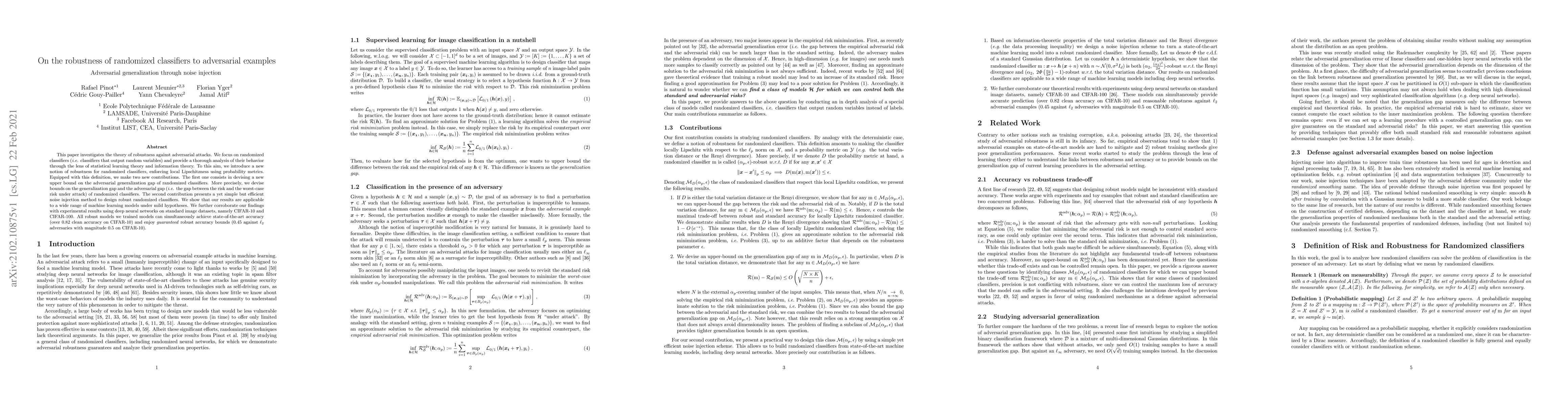 This paper investigates the theory of robustness against adversarial attacks. We focus on randomized classifiers (\emph{i.e.} classifiers that output random variables) and provide a thorough analysis of their behavior through the lens of statistical learning theory and information theory. To this aim, we introduce a new notion of robustness for randomized classifiers, enforcing local Lipschitzness using probability metrics. Equipped with this definition, we make two new contributions. The first one consists in devising a new upper bound on the adversarial generalization gap of randomized classifiers. More precisely, we devise bounds on the generalization gap and the adversarial gap (\emph{i.e.} the gap between the risk and the worst-case risk under attack) of randomized classifiers. The second contribution presents a yet simple but efficient noise injection method to design robust randomized classifiers. We show that our results are applicable to a wide range of machine learning models under mild hypotheses. We further corroborate our findings with experimental results using deep neural networks on standard image datasets, namely CIFAR-10 and CIFAR-100. All robust models we trained models can simultaneously achieve state-of-the-art accuracy (over $0.82$ clean accuracy on CIFAR-10) and enjoy \emph{guaranteed} robust accuracy bounds ($0.45$ against $\ell_2$ adversaries with magnitude $0.5$ on CIFAR-10).