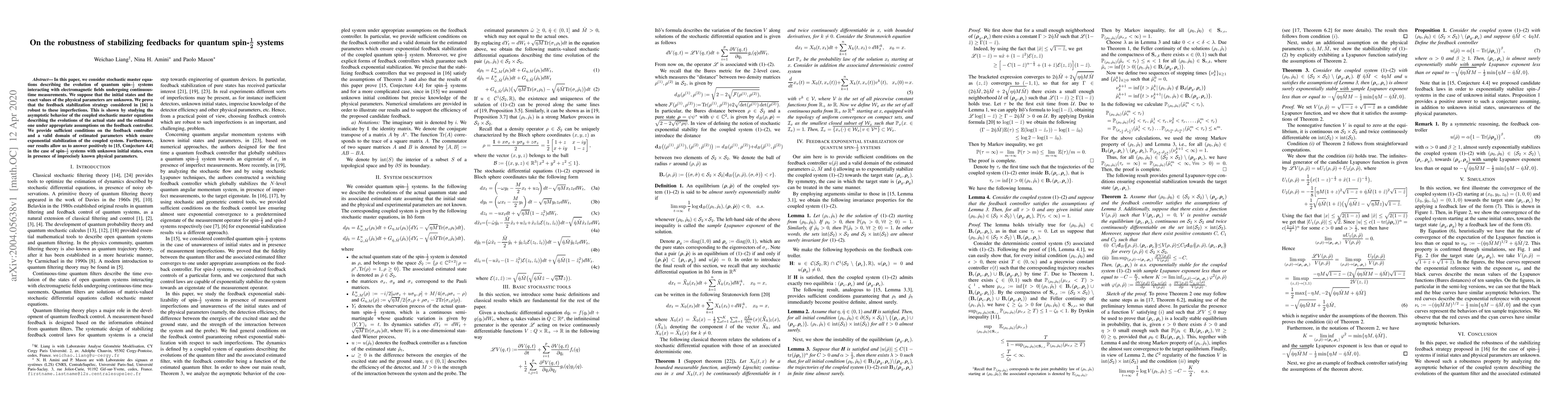 In this paper, we consider stochastic master equations describing the evolution of quantum spin-1/2 systems interacting with electromagnetic fields undergoing continuous-time measurements. We suppose that the initial states and the exact values of the physical parameters are unknown. We prove that the feedback stabilization strategy considered in [16] is robust to these imperfections. This is shown by studying the asymptotic behavior of the coupled stochastic master equations describing the evolutions of the actual state and the estimated one under appropriate assumptions on the feedback controller. We provide sufficient conditions on the feedback controller and a valid domain of estimated parameters which ensure exponential stabilization of the coupled system. Furthermore, our results allow us to answer positively to [15,Conjecture 4.4] in the case of spin-1/2 systems with unknown initial states, even in presence of imprecisely known physical parameters.