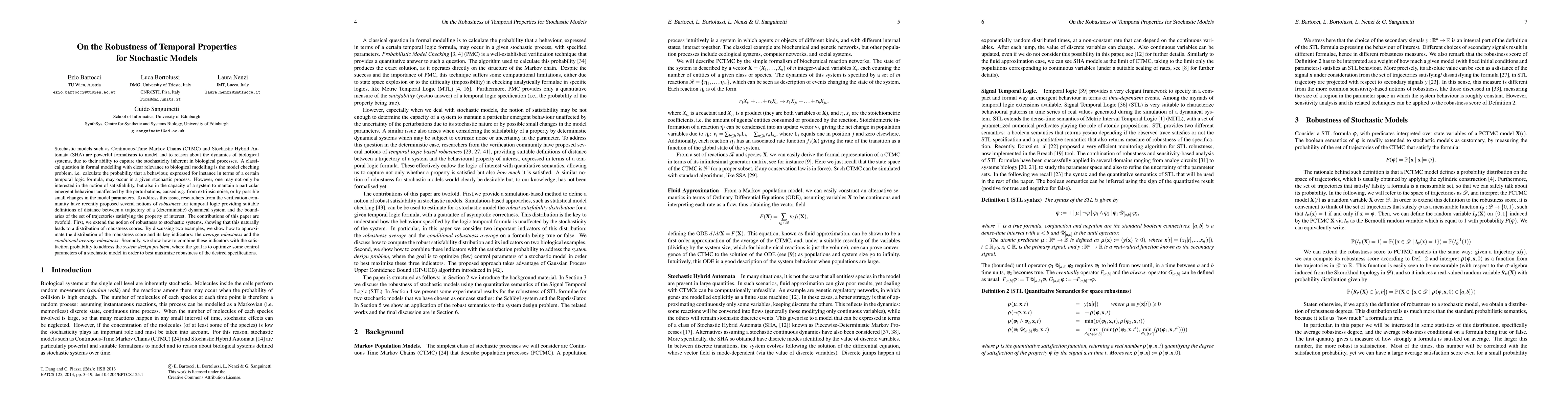 Stochastic models such as Continuous-Time Markov Chains (CTMC) and Stochastic Hybrid Automata (SHA) are powerful formalisms to model and to reason about the dynamics of biological systems, due to their ability to capture the stochasticity inherent in biological processes. A classical question in formal modelling with clear relevance to biological modelling is the model checking problem. i.e. calculate the probability that a behaviour, expressed for instance in terms of a certain temporal logic formula, may occur in a given stochastic process. However, one may not only be interested in the notion of satisfiability, but also in the capacity of a system to mantain a particular emergent behaviour unaffected by the perturbations, caused e.g. from extrinsic noise, or by possible small changes in the model parameters. To address this issue, researchers from the verification community have recently proposed several notions of robustness for temporal logic providing suitable definitions of distance between a trajectory of a (deterministic) dynamical system and the boundaries of the set of trajectories satisfying the property of interest. The contributions of this paper are twofold. First, we extend the notion of robustness to stochastic systems, showing that this naturally leads to a distribution of robustness scores. By discussing two examples, we show how to approximate the distribution of the robustness score and its key indicators: the average robustness and the conditional average robustness. Secondly, we show how to combine these indicators with the satisfaction probability to address the system design problem, where the goal is to optimize some control parameters of a stochastic model in order to best maximize robustness of the desired specifications.