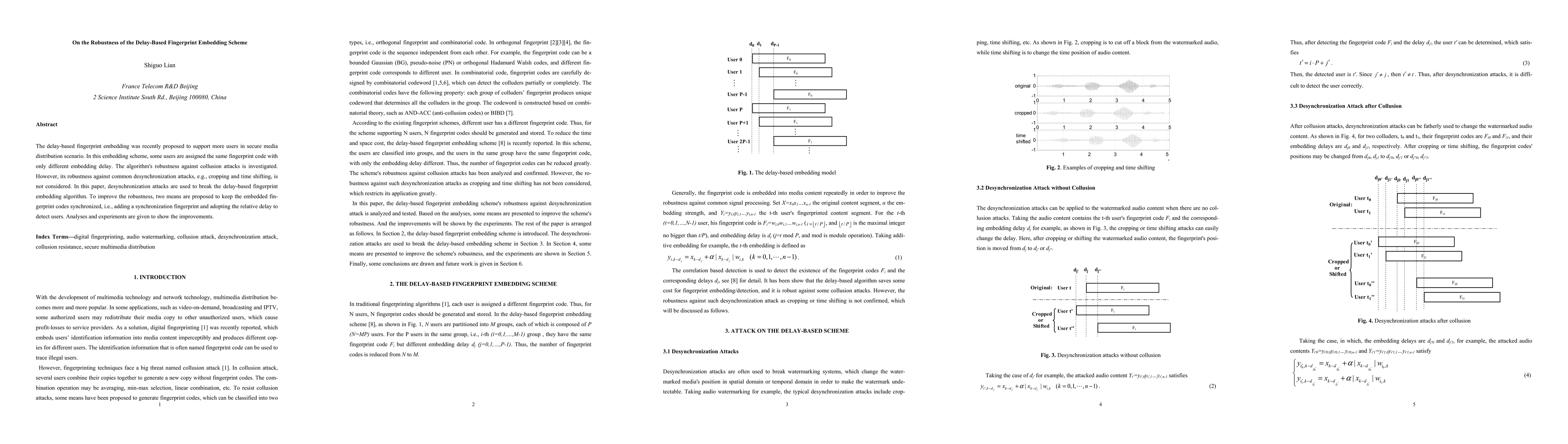 The delay-based fingerprint embedding was recently proposed to support more users in secure media distribution scenario. In this embedding scheme, some users are assigned the same fingerprint code with only different embedding delay. The algorithm's robustness against collusion attacks is investigated. However, its robustness against common desynchronization attacks, e.g., cropping and time shifting, is not considered. In this paper, desynchronization attacks are used to break the delay-based fingerprint embedding algorithm. To improve the robustness, two means are proposed to keep the embedded fingerprint codes synchronized, i.e., adding a synchronization fingerprint and adopting the relative delay to detect users. Analyses and experiments are given to show the improvements.