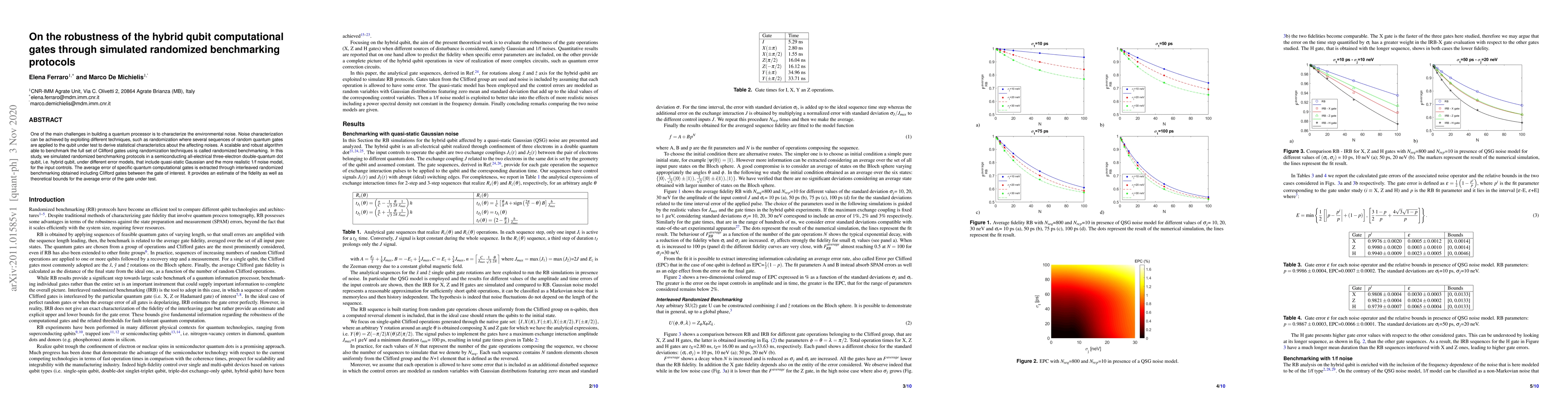 This paper investigates the robustness of hybrid qubit computational gates using randomized benchmarking protocols, simulating various noise models to characterize environmental noise and estimate gate fidelity under quasi-static Gaussian and 1/f noise conditions. The study provides theoretical bounds for the average error of specific gates.