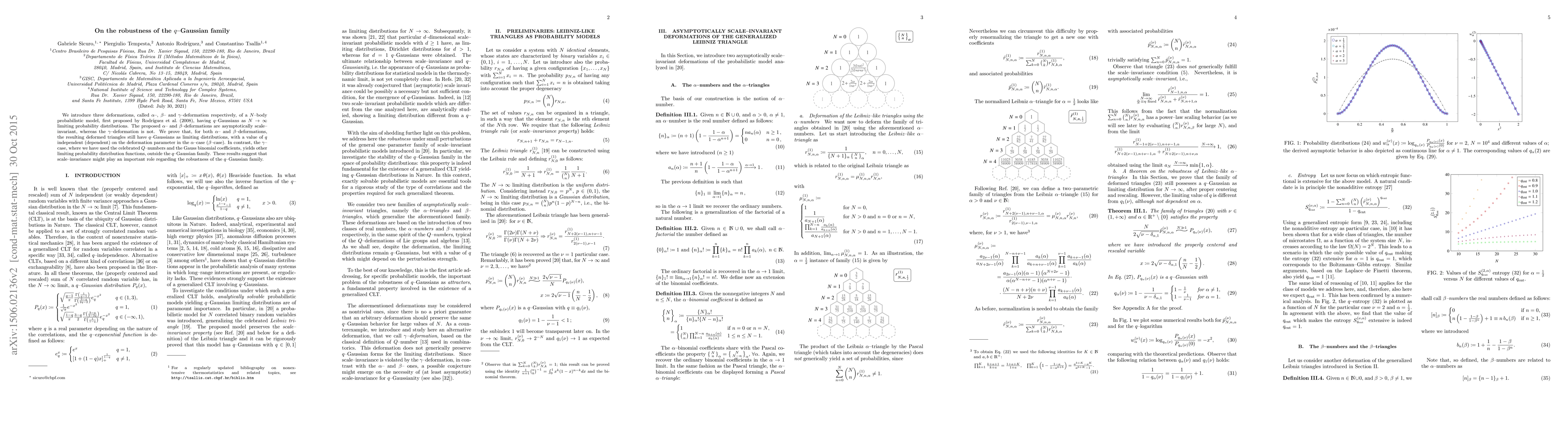 We introduce three deformations, called $\alpha$-, $\beta$- and $\gamma$-deformation respectively, of a $N$-body probabilistic model, first proposed by Rodr\'iguez et al. (2008), having $q$-Gaussians as $N\to\infty$ limiting probability distributions. The proposed $\alpha$- and $\beta$-deformations are asymptotically scale-invariant, whereas the $\gamma$-deformation is not. We prove that, for both $\alpha$- and $\beta$-deformations, the resulting deformed triangles still have $q$-Gaussians as limiting distributions, with a value of $q$ independent (dependent) on the deformation parameter in the $\alpha$-case ($\beta$-case). In contrast, the $\gamma$-case, where we have used the celebrated $Q$-numbers and the Gauss binomial coefficients, yields other limiting probability distribution functions, outside the $q$-Gaussian family. These results suggest that scale-invariance might play an important role regarding the robustness of the $q$-Gaussian family.