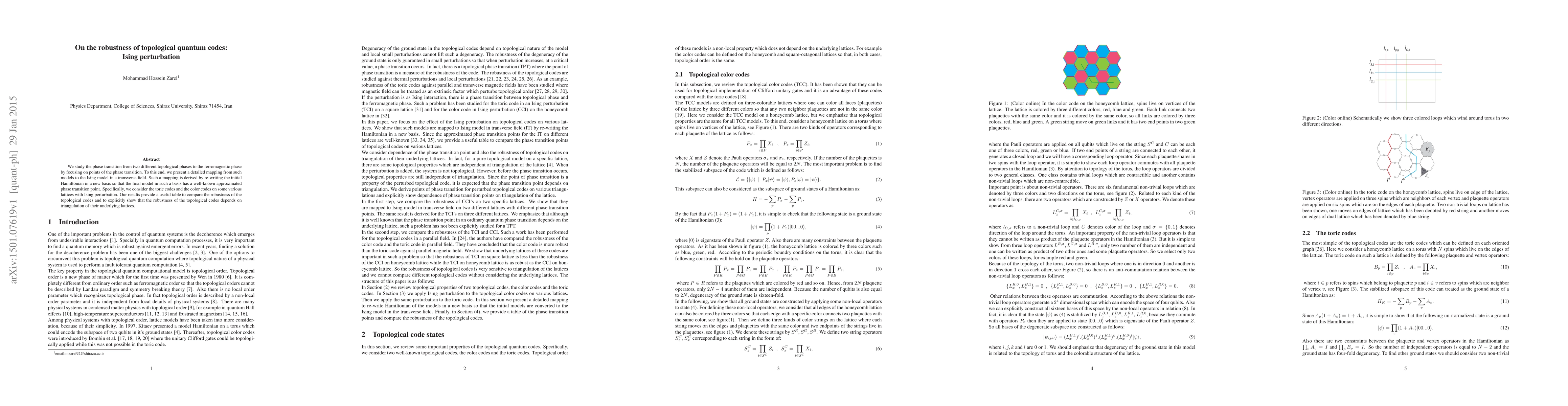 This research examines the phase transitions in topological quantum codes, specifically toric and color codes, under Ising perturbation. By mapping these models to the Ising model in a transverse field, the study reveals that the robustness of topological codes is influenced by the triangulation of their lattice structures, providing a comparative table for their resilience.
