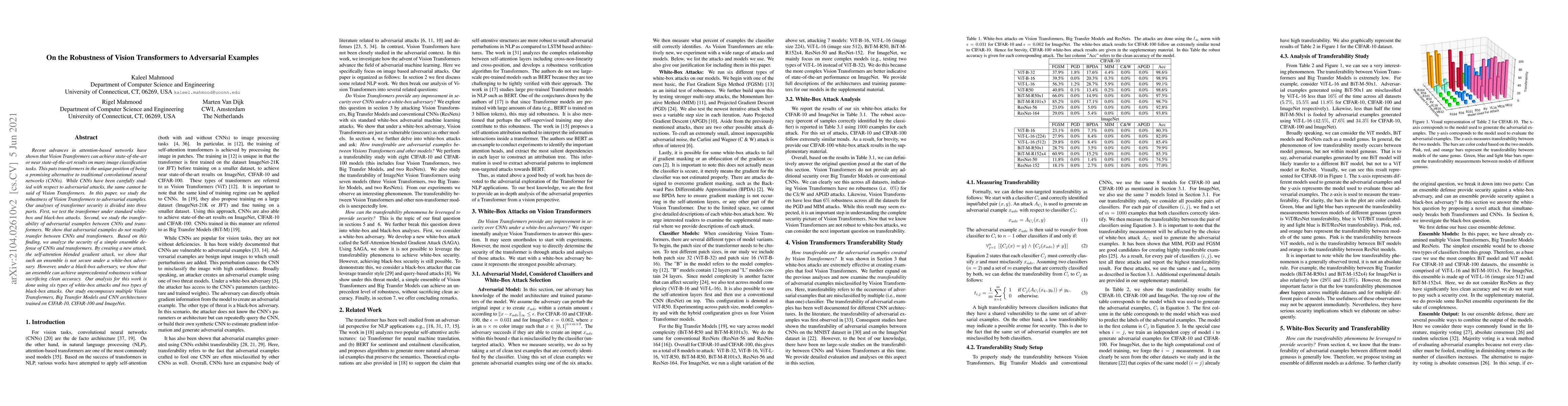 This paper investigates the robustness of Vision Transformers against adversarial examples, comparing them to traditional CNNs. It finds that adversarial examples do not easily transfer between the two, but an ensemble of CNNs and transformers can achieve high robustness under black-box attacks, though not against a white-box attack where a new attack method, the self-attention blended gradient attack, is introduced.