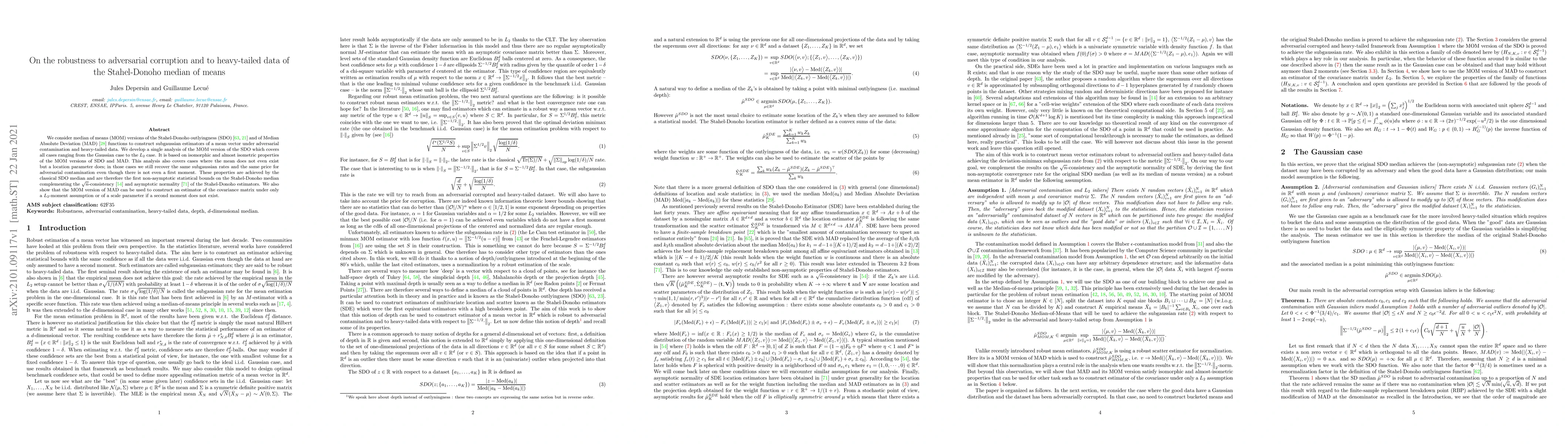 We consider median of means (MOM) versions of the Stahel-Donoho outlyingness (SDO) [stahel 1981, donoho 1982] and of Median Absolute Deviation (MAD) functions to construct subgaussian estimators of a mean vector under adversarial contamination and heavy-tailed data. We develop a single analysis of the MOM version of the SDO which covers all cases ranging from the Gaussian case to the L2 case. It is based on isomorphic and almost isometric properties of the MOM versions of SDO and MAD. This analysis also covers cases where the mean does not even exist but a location parameter does; in those cases we still recover the same subgaussian rates and the same price for adversarial contamination even though there is not even a first moment. These properties are achieved by the classical SDO median and are therefore the first non-asymptotic statistical bounds on the Stahel-Donoho median complementing the $\sqrt{n}$-consistency [maronna 1995] and asymptotic normality [Zuo, Cui, He, 2004] of the Stahel-Donoho estimators. We also show that the MOM version of MAD can be used to construct an estimator of the covariance matrix under only a L2-moment assumption or of a scale parameter if a second moment does not exist.