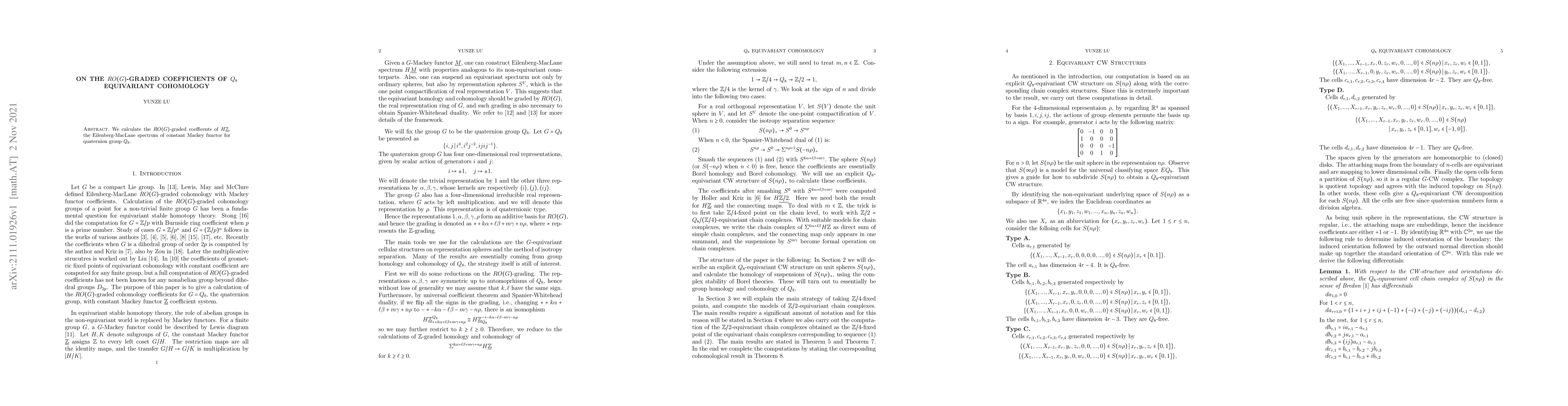 This paper computes the $RO(G)$-graded coefficients of the equivariant cohomology $H\underline{\mathbb{Z}}$ for the quaternion group $Q_8$, focusing on the structure of these coefficients in the context of $RO(G)$-graded theory. The results provide insights into the equivariant cohomology with respect to the quaternion group.