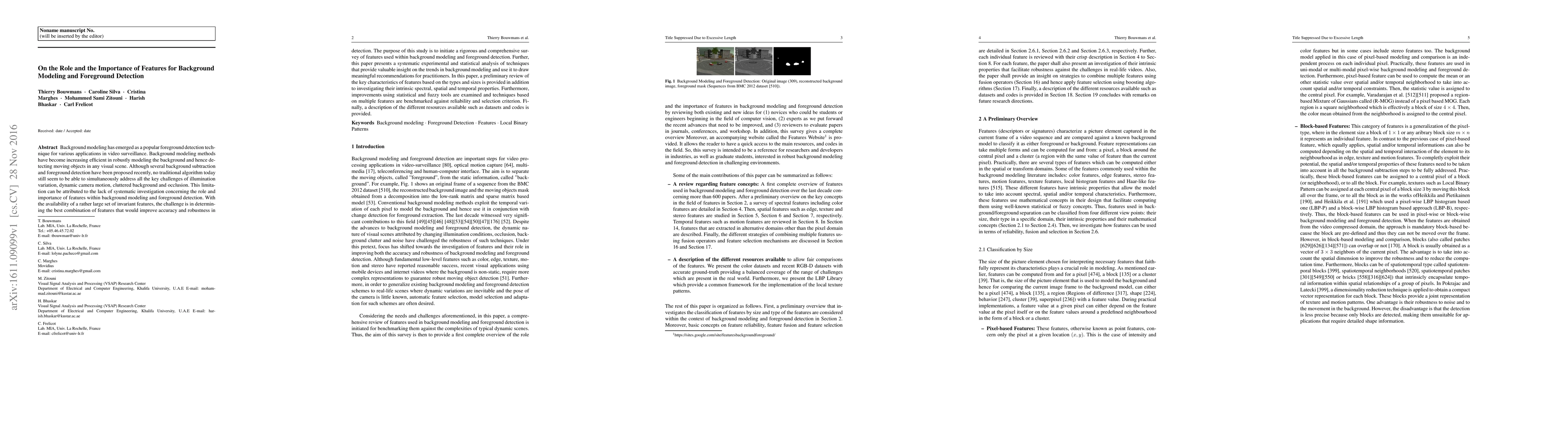 This paper conducts a comprehensive survey of the role and importance of various features in background modeling and foreground detection for video surveillance. It systematically analyzes techniques and benchmarks multiple feature-based methods, providing recommendations for practitioners and detailing available datasets and codes.