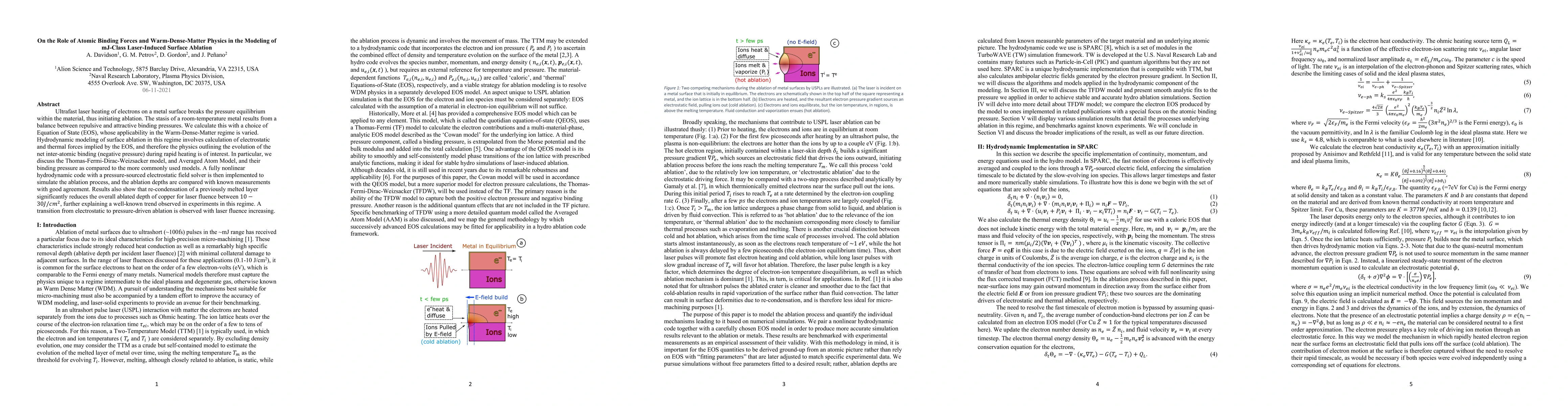 Ultrafast laser heating of electrons on a metal surface breaks the pressure equilibrium within the material, thus initiating ablation. The stasis of a room-temperature metal results from a balance between repulsive and attractive binding pressures. We calculate this with a choice of Equation of State (EOS), whose applicability in the Warm-Dense-Matter regime is varied. Hydrodynamic modeling of surface ablation in this regime involves calculation of electrostatic and thermal forces implied by the EOS, and therefore the physics outlining the evolution of the net inter-atomic binding (negative pressure) during rapid heating is of interest. In particular, we discuss the Thomas-Fermi-Dirac-Weizsacker model, and Averaged Atom Model, and their binding pressure as compared to the more commonly used models. A fully nonlinear hydrodynamic code with a pressure-sourced electrostatic field solver is then implemented to simulate the ablation process, and the ablation depths are compared with known measurements with good agreement. Results also show that re-condensation of a previously melted layer significantly reduces the overall ablated depth of copper for laser fluence between 10-30J/cm^2, further explaining a well-known trend observed in experiments in this regime. A transition from electrostatic to pressure-driven ablation is observed with laser fluence increasing.