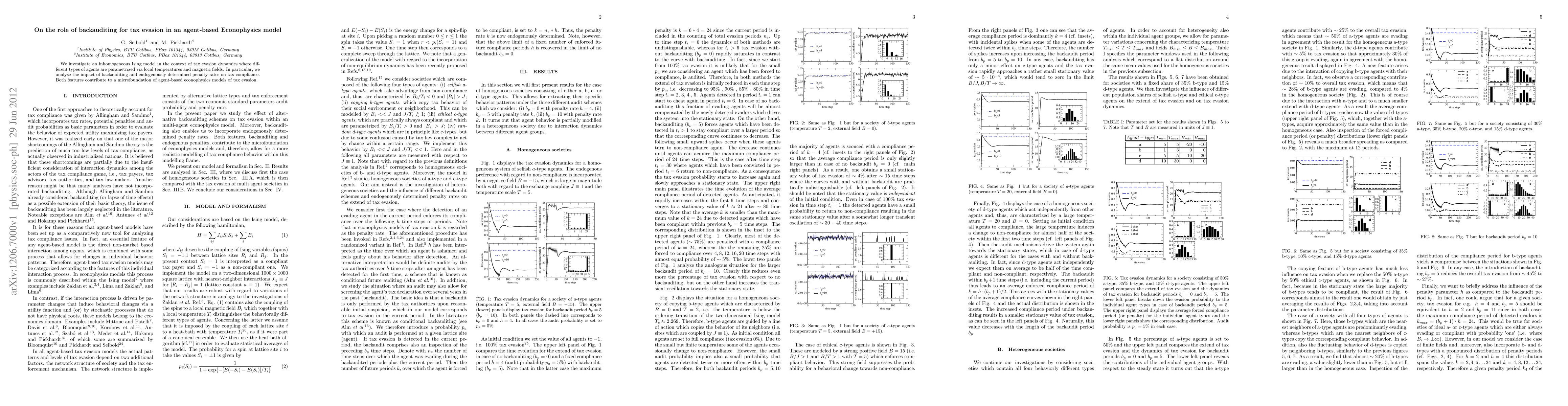 This paper explores an inhomogeneous Ising model to study tax evasion dynamics, where agents are characterized by local temperatures and magnetic fields. It examines how backauditing and endogenous penalty rates influence tax compliance, providing microfoundations for agent-based econophysics models of tax evasion.