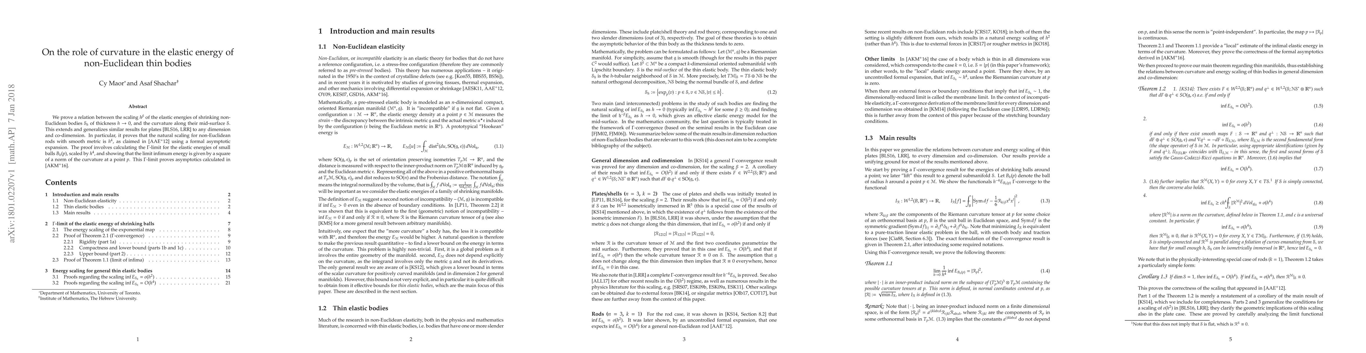 We prove a relation between the scaling $h^\beta$ of the elastic energies of shrinking non-Euclidean bodies $S_h$ of thickness $h\to 0$, and the curvature along their mid-surface $S$. This extends and generalizes similar results for plates [BLS16, LRR] to any dimension and co-dimension. In particular, it proves that the natural scaling for non-Euclidean rods with smooth metric is $h^4$, as claimed in [AAE+12] using a formal asymptotic expansion. The proof involves calculating the $\Gamma$-limit for the elastic energies of small balls $B_h(p)$, scaled by $h^4$, and showing that the limit infimum energy is given by a square of a norm of the curvature at a point $p$. This $\Gamma$-limit proves asymptotics calculated in [AKM+16].