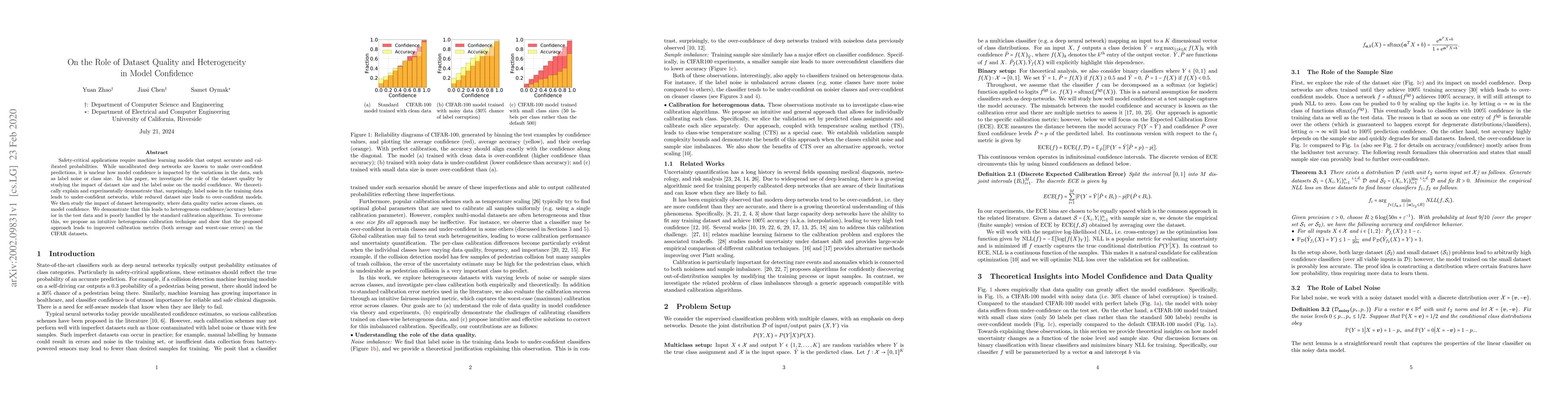 Safety-critical applications require machine learning models that output accurate and calibrated probabilities. While uncalibrated deep networks are known to make over-confident predictions, it is unclear how model confidence is impacted by the variations in the data, such as label noise or class size. In this paper, we investigate the role of the dataset quality by studying the impact of dataset size and the label noise on the model confidence. We theoretically explain and experimentally demonstrate that, surprisingly, label noise in the training data leads to under-confident networks, while reduced dataset size leads to over-confident models. We then study the impact of dataset heterogeneity, where data quality varies across classes, on model confidence. We demonstrate that this leads to heterogenous confidence/accuracy behavior in the test data and is poorly handled by the standard calibration algorithms. To overcome this, we propose an intuitive heterogenous calibration technique and show that the proposed approach leads to improved calibration metrics (both average and worst-case errors) on the CIFAR datasets.