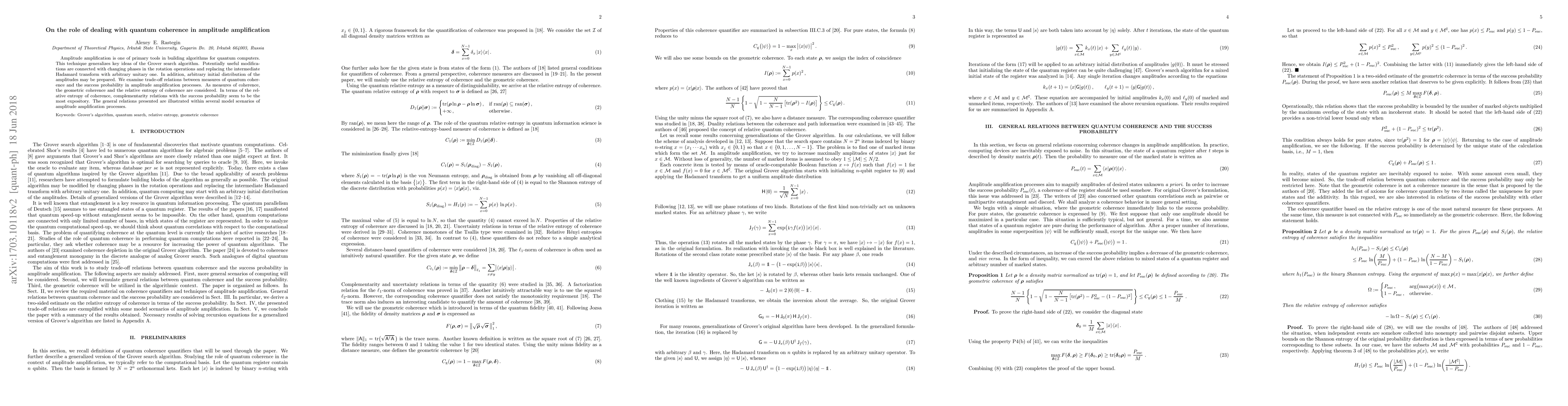 This paper explores how quantum coherence measures, such as geometric coherence and the relative entropy of coherence, impact the success probability in amplitude amplification processes, a key technique in quantum computing. It highlights complementarity relations between coherence measures and success probability, illustrated through various model scenarios.