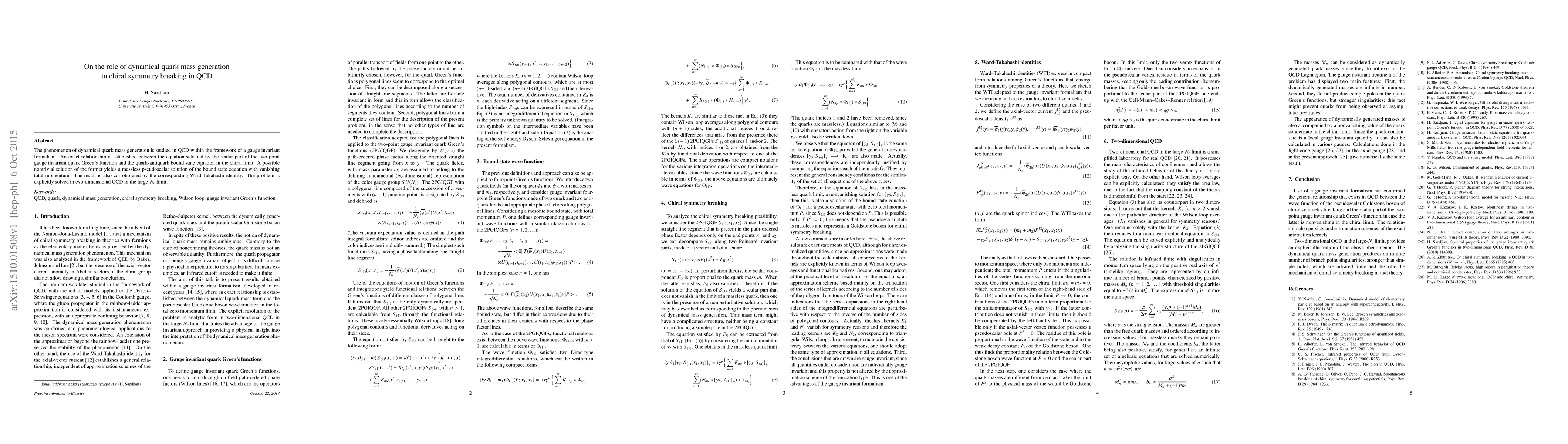 The phenomenon of dynamical quark mass generation is studied in QCD within the framework of a gauge invariant formalism. An exact relationship is established between the equation satisfied by the scalar part of the two-point gauge invariant quark Green's function and the quark-antiquark bound state equation in the chiral limit. A possible nontrivial solution of the former yields a massless pseudoscalar solution of the bound state equation with vanishing total momentum. The result is also corroborated by the corresponding Ward-Takahashi identity. The problem is explicitly solved in two-dimensional QCD in the large-$N_c$ limit.