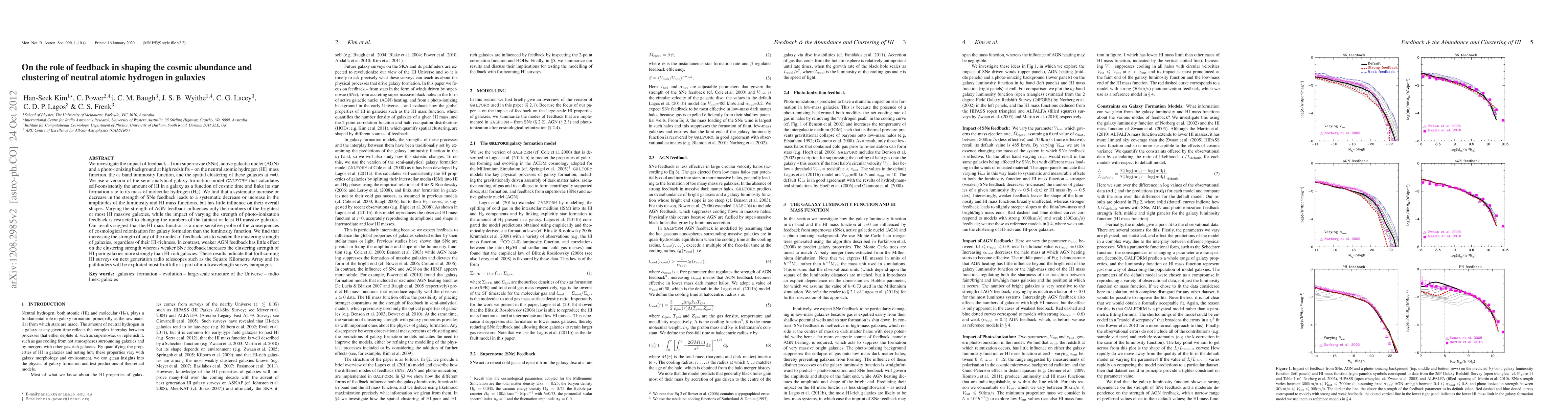 We investigate the impact of feedback - from supernovae (SNe), active galactic nuclei (AGN) and a photo-ionizing background at high redshifts - on the neutral atomic hydrogen (HI) mass function, the $b_{\rm J}$ band luminosity function, and the spatial clustering of these galaxies at $z$=0. We use a version of the semi-analytical galaxy formation model GALFORM that calculates self-consistently the amount of HI in a galaxy as a function of cosmic time and links its star formation rate to its mass of molecular hydrogen (H$_2$). We find that a systematic increase or decrease in the strength of SNe feedback leads to a systematic decrease or increase in the amplitudes of the luminosity and HI mass functions, but has little influence on their overall shapes. Varying the strength of AGN feedback influences only the numbers of the brightest or most HI massive galaxies, while the impact of varying the strength of photo-ionization feedback is restricted to changing the numbers of the faintest or least HI massive galaxies.Our results suggest that the HI mass function is a more sensitive probe of the consequences of cosmological reionization for galaxy formation than the luminosity function. We find that increasing the strength of any of the modes of feedback acts to weaken the clustering strength of galaxies, regardless of their HI-richness. In contrast, weaker AGN feedback has little effect on the clustering strength whereas weaker SNe feedback increases the clustering strength of HI-poor galaxies more strongly than HI-rich galaxies. These results indicate that forthcoming HI surveys on next generation radio telescopes such as the Square Kilometre Array and its pathfinders will be exploited most fruitfully as part of multiwavelength survey campaigns.
