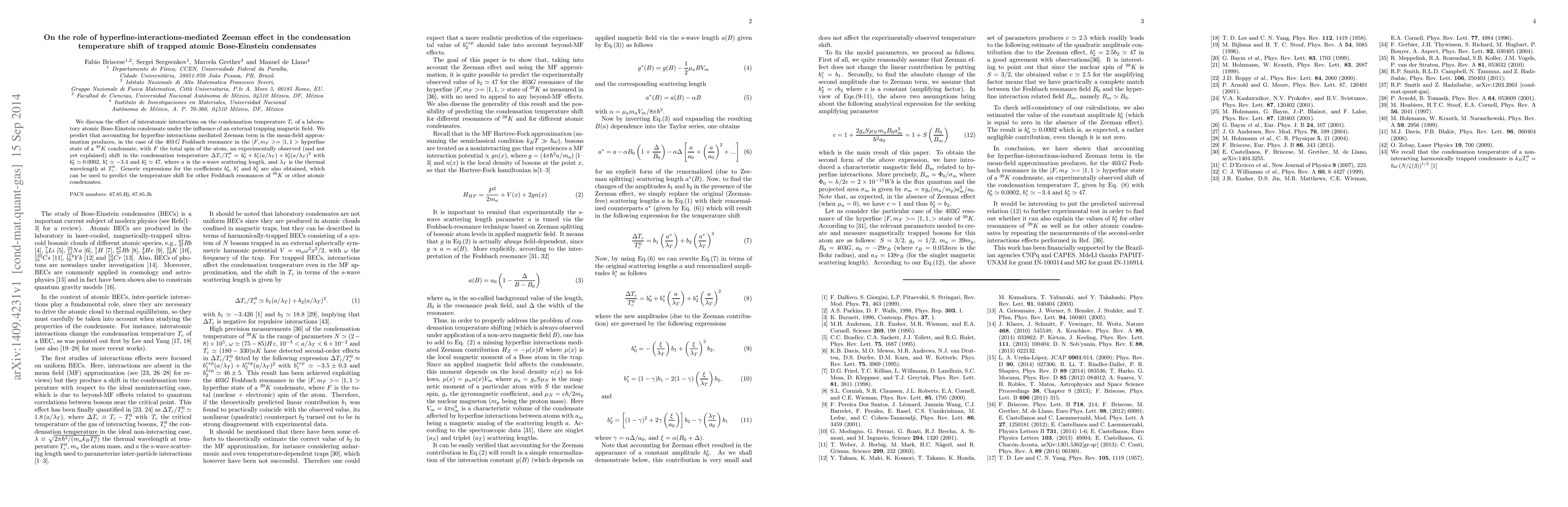 This paper investigates the impact of hyperfine-interactions-mediated Zeeman effect on the condensation temperature $T_c$ of trapped atomic Bose-Einstein condensates, specifically predicting a shift in $T_c$ for a $403 \, G$ Feshbach resonance in $^{39}K$ condensates, with derived coefficients for the temperature shift.