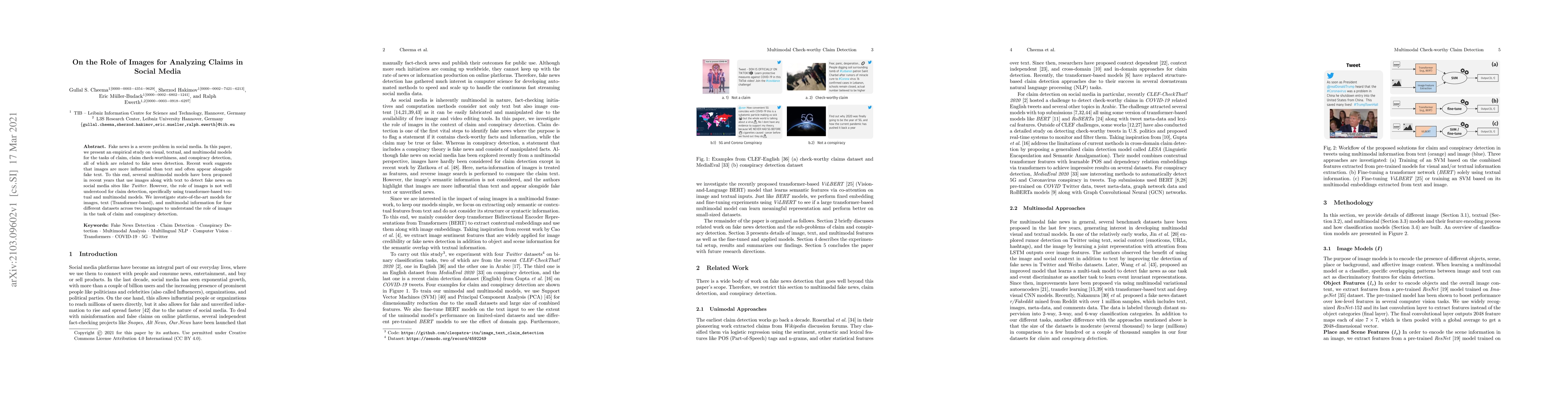 This paper investigates the effectiveness of images, textual, and multimodal models for detecting fake news, claim check-worthiness, and conspiracy theories on social media. It explores the role of images in transformer-based models across various datasets to determine their contribution to claim detection.