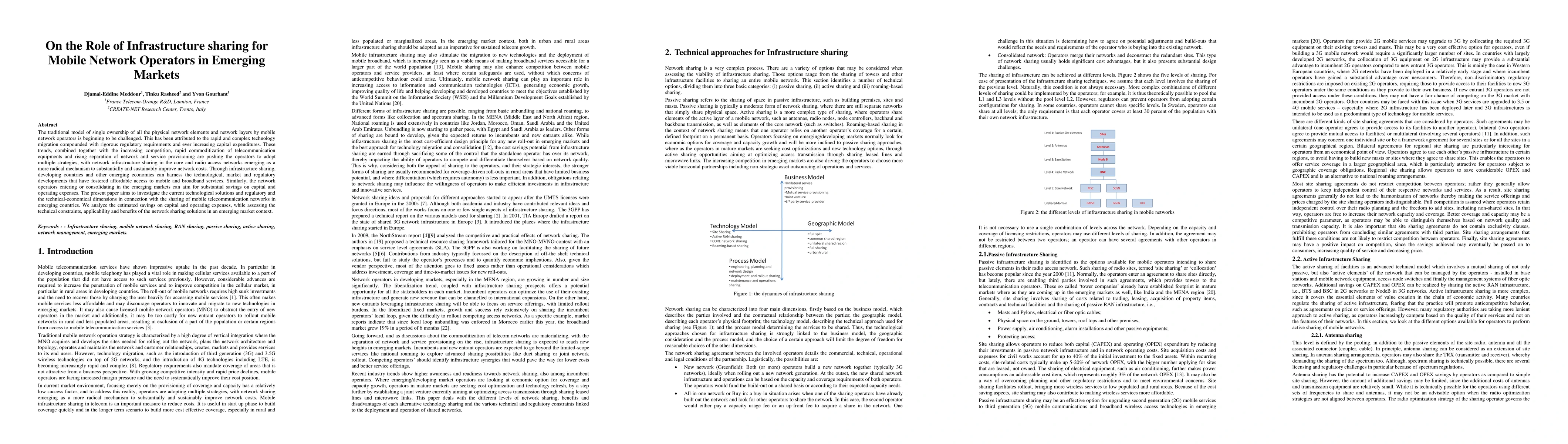 This paper explores how infrastructure sharing among mobile network operators can reduce costs and improve access to mobile and broadband services in emerging markets. It investigates the technological, regulatory, and economic aspects of network sharing, assessing potential savings and technical constraints in these contexts.