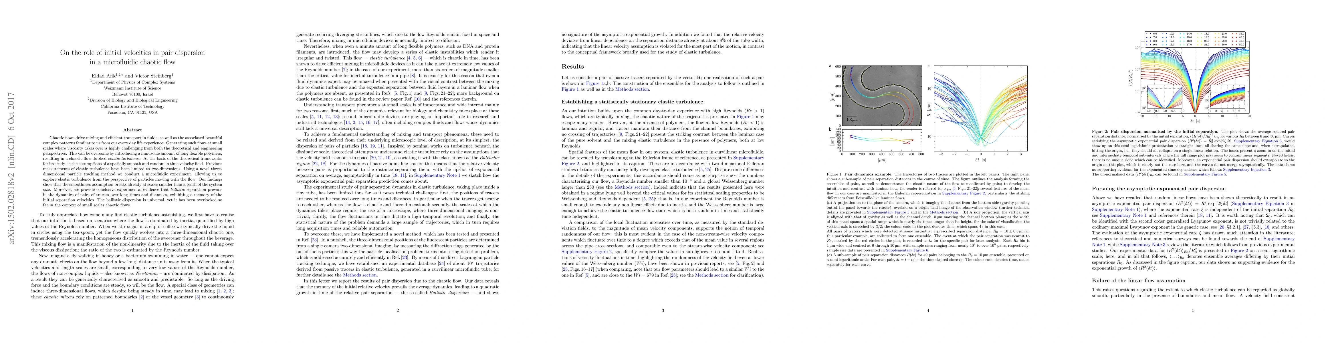 Chaotic flows drive mixing and efficient transport in fluids, as well as the associated beautiful complex patterns familiar to us from our every day life experience. Generating such flows at small scales where viscosity takes over is highly challenging from both the theoretical and engineering perspectives. This can be overcome by introducing a minuscule amount of long flexible polymers, resulting in a chaotic flow dubbed \textit{elastic turbulence}. At the basis of the theoretical frameworks for its study lie the assumptions of a spatially smooth and random-in-time velocity field. Previous measurements of elastic turbulence have been limited to two-dimensions. Using a novel three-dimensional particle tracking method, we conduct a microfluidic experiment, allowing us to explore elastic turbulence from the perspective of particles moving with the flow. Our findings show that the smoothness assumption breaks already at scales smaller than a tenth of the system size. Moreover, we provide conclusive experimental evidence that \textit{ballistic} separation prevails in the dynamics of pairs of tracers over long times and distances, exhibiting a memory of the initial separation velocities. The ballistic dispersion is universal, yet it has been overlooked so far in the context of small scales chaotic flows.