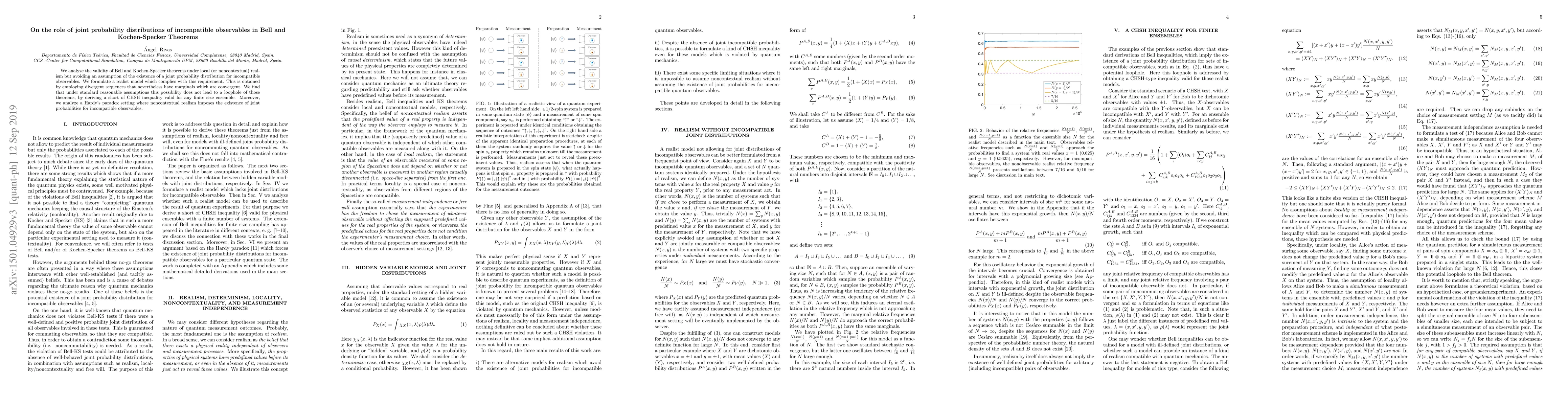 This paper explores the implications of Bell and Kochen-Specker theorems without assuming joint probability distributions for incompatible observables, proposing a realist model using convergent marginals from divergent sequences. It shows that this approach does not circumvent the theorems, deriving a CHSH inequality for finite ensembles and analyzing Hardy's paradox in noncontextual realism.