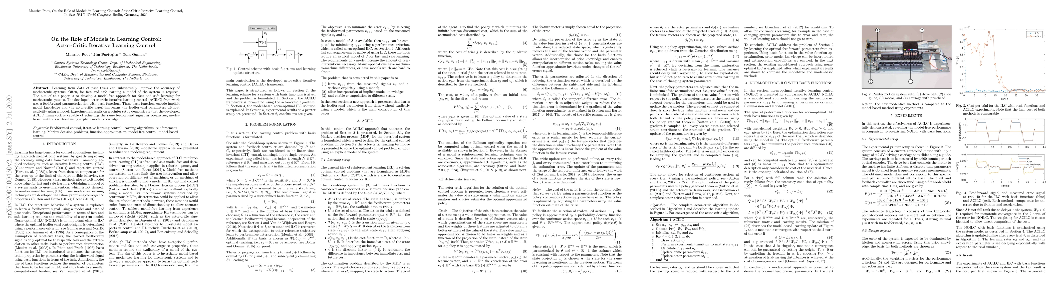 Learning from data of past tasks can substantially improve the accuracy of mechatronic systems. Often, for fast and safe learning a model of the system is required. The aim of this paper is to develop a model-free approach for fast and safe learning for mechatronic systems. The developed actor-critic iterative learning control (ACILC) framework uses a feedforward parameterization with basis functions. These basis functions encode implicit model knowledge and the actor-critic algorithm learns the feedforward parameters without explicitly using a model. Experimental results on a printer setup demonstrate that the developed ACILC framework is capable of achieving the same feedforward signal as preexisting model-based methods without using explicit model knowledge.