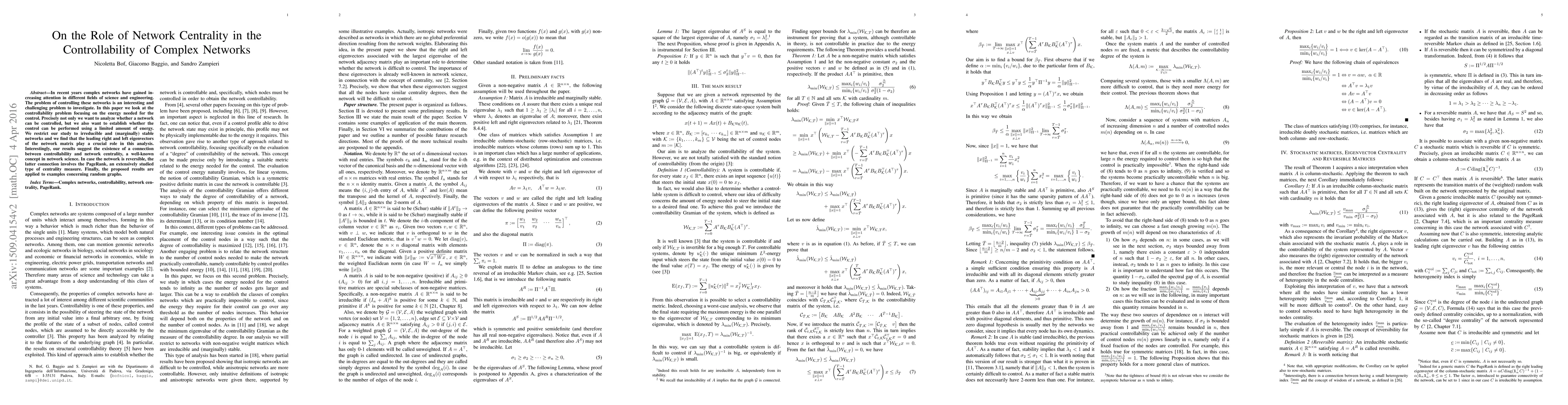 This paper investigates the controllability of complex networks, focusing on the energy required for control, and finds that network centrality measures, particularly the leading eigenvectors and PageRank in reversible networks, play a crucial role in determining controllability. The study applies these findings to random graphs.