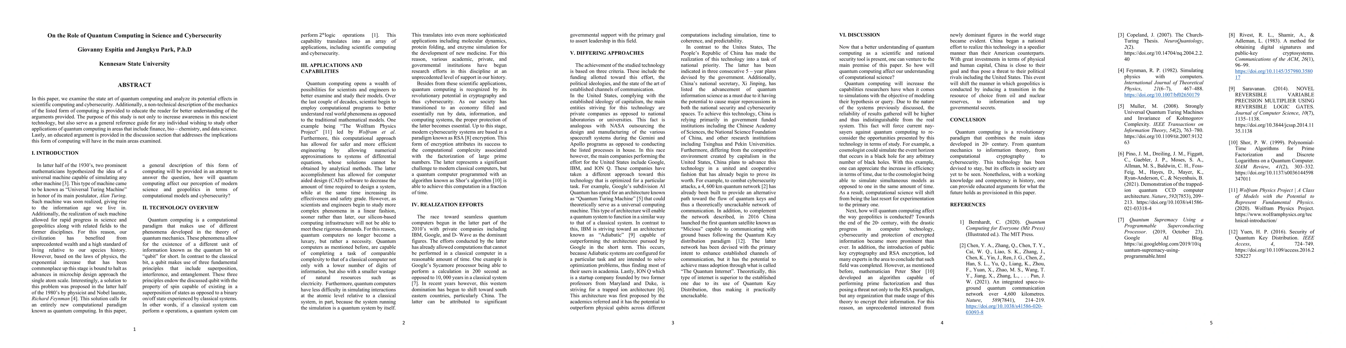 In this paper, we examine the state art of quantum computing and analyze its potential effects in scientific computing and cybersecurity. Additionally, a non-technical description of the mechanics of the listed form of computing is provided to educate the reader for better understanding of the arguments provided. The purpose of this study is not only to increase awareness in this nescient technology, but also serve as a general reference guide for any individual wishing to study other applications of quantum computing in areas that include finance, chemistry, and data science. Lastly, an educated argument is provided in the discussion section that addresses the implications this form of computing will have in the main areas examined.