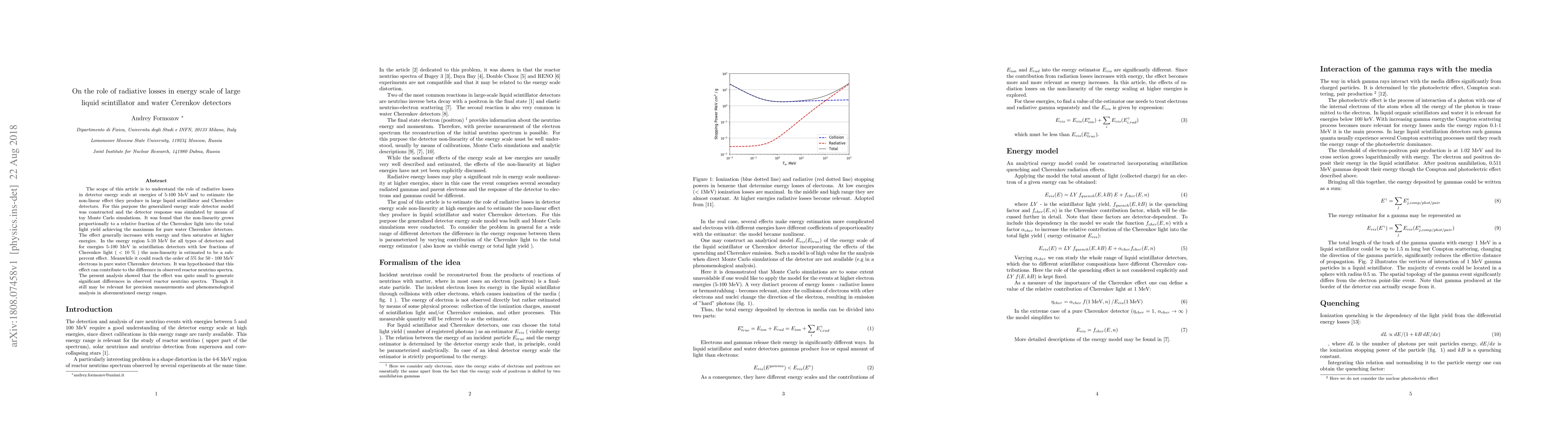 The scope of this article is to understand the role of radiative losses in detector energy scale at energies of 5-100 MeV and to estimate the non-linear effect they produce in large liquid scintillator and Cherenkov detectors. For this purpose the generalized energy scale detector model was constructed and the detector response was simulated by means of toy Monte Carlo simulations. It was found that the non-linearity grows proportionally to a relative fraction of the Cherenkov light into the total light yield achieving the maximum for pure water Cherenkov detectors. The effect generally increases with energy and then saturates at higher energies. In the energy region 5-10 MeV for all types of detectors and for energies 5-100 MeV in scintillation detectors with low fractions of Cherenkov light ( < 10 % ) the non-linearity is estimated to be a sub- percent effect. Meanwhile it could reach the order of 5% for 50 - 100 MeV electrons in pure water Cherenkov detectors. It was hypothesised that this effect can contribute to the difference in observed reactor neutrino spectra. The present analysis showed that the effect was quite small to generate significant differences in observed reactor neutrino spectra. Though it still may be relevant for precision measurements and phenomenological analysis in aforementioned energy ranges.