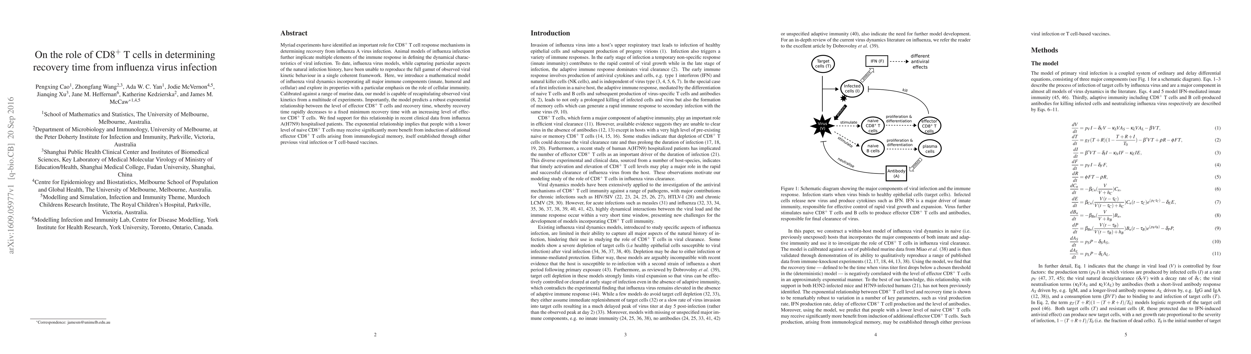 Myriad experiments have identified an important role for $\rm CD8^+$ T cell response mechanisms in determining recovery from influenza A virus infection. Animal models of influenza infection further implicate multiple elements of the immune response in defining the dynamical characteristics of viral infection. To date, influenza virus models, while capturing particular aspects of the natural infection history, have been unable to reproduce the full gamut of observed viral kinetic behaviour in a single coherent framework. Here, we introduce a mathematical model of influenza viral dynamics incorporating all major immune components (innate, humoral and cellular) and explore its properties with a particular emphasis on the role of cellular immunity. Calibrated against a range of murine data, our model is capable of recapitulating observed viral kinetics from a multitude of experiments. Importantly, the model predicts a robust exponential relationship between the level of effector $\rm CD8^+$ T cells and recovery time, whereby recovery time rapidly decreases to a fixed minimum recovery time with an increasing level of effector $\rm CD8^+$ T cells. We find support for this relationship in recent clinical data from influenza A(H7N9) hospitalised patients. The exponential relationship implies that people with a lower level of naive $\rm CD8^+$ T cells may receive significantly more benefit from induction of additional effector $\rm CD8^+$ T cells arising from immunological memory, itself established through either previous viral infection or T cell-based vaccines.